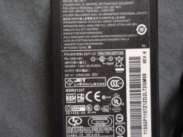 lenovo ACアダプタ 92P1107 PA-1900-081 20V 3.25A 円形プラグ 送料185円から