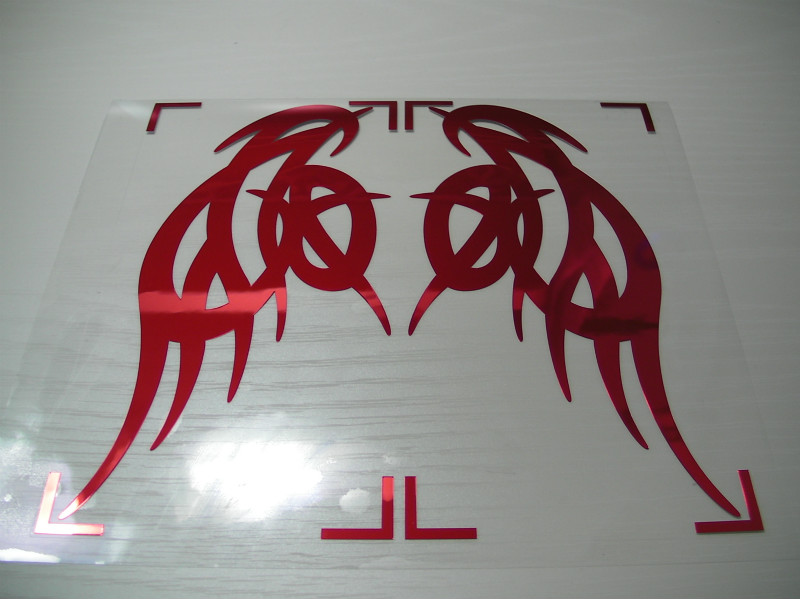 透明のフィルムに印刷されているタイプのステッカーではありません。絵柄にそってシートを切り抜いたカッティングステッカーとなります。透明の転写シートがステッカーの上に貼られていますので、転写シートごと台紙から剥がし、貼り付けたあと転写シートを剥がすと塩ビ素材の耐久性の高いステッカー本体のみが残ります。水上バイクはもちろん、サーフボード、スノーボード、車などにも使用実績があります。少し技術が必要ですが、ゆるやかな曲面であれば貼る事が出来ます。(伸ばしすぎると白く変色して鏡面感が無くなるのでご注意ください)