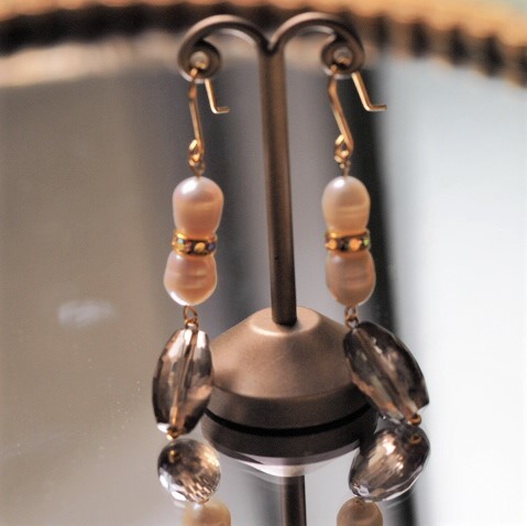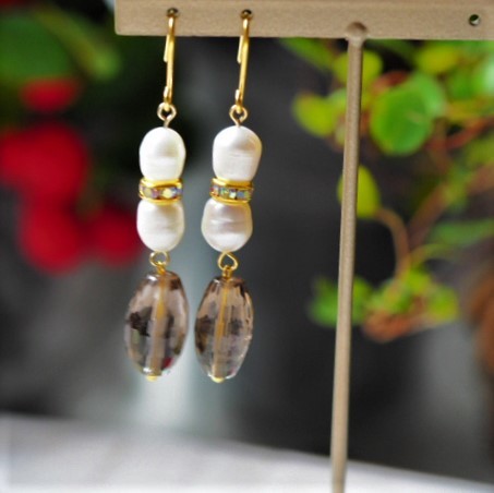 スモーキークォーツと淡水パールのピアスです。