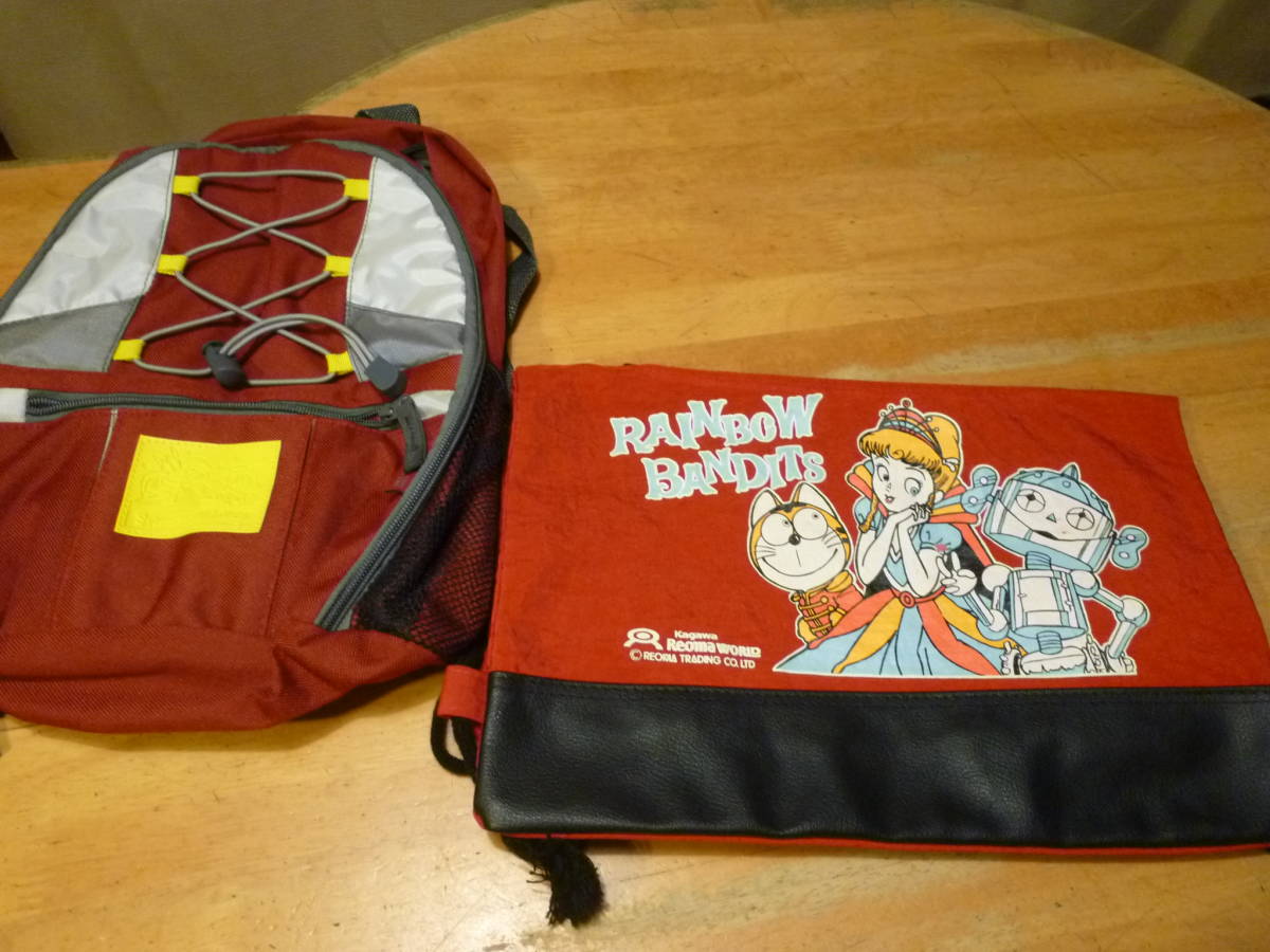 どちらも未使用の為に問題は無いと思いますが、薄い変色等は少しあると思います。ナップサックのキャラクタープリントには小さな剥がれ箇所も少しありますがそのまま一緒に梱包しお送り致します。