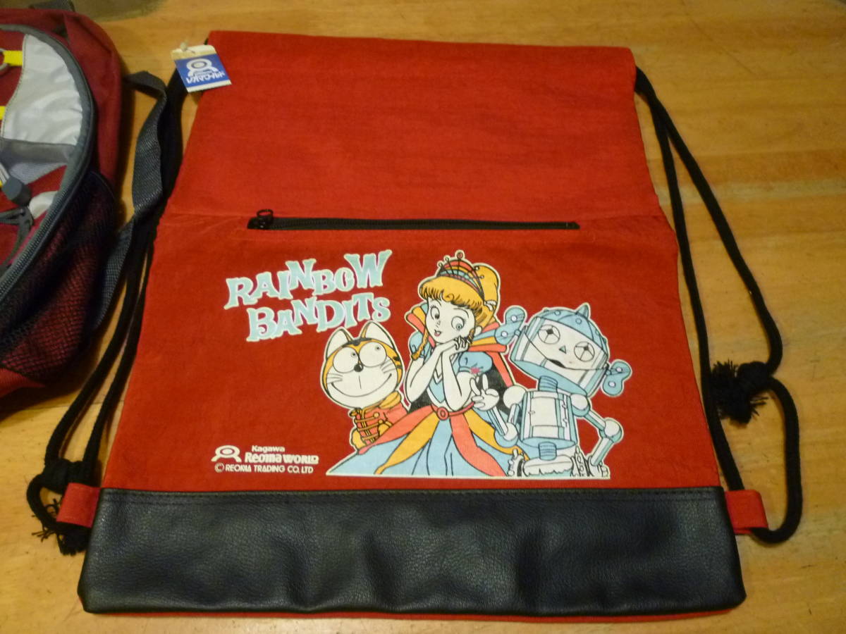 こちらはお子様用に丁度のリュックとナップサックのセットになります。リュックの表面にはシルベスタとトィンティの掘り込み入りロゴが付いたポケットが、その裏全体は左右底からのファスナーでの収納が、その裏にはサイド中間からのファスナーで大きな収納箇所があり、マチ両側にも網目の収納箇所が、タグにはNOT FOR SALEとあります。RAINBOW BANDITSのネームとお姫様とならず者?のプリントがあるナップサックは香川県にあるレオマワールドのキャラクター達の様ですがオープン当初のものか現在のものかははっきりしません。