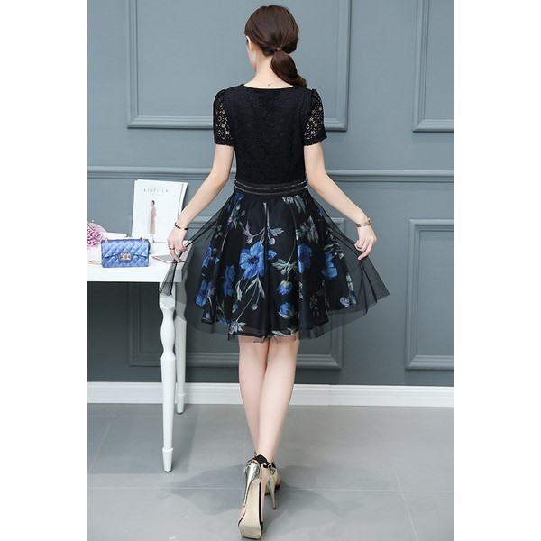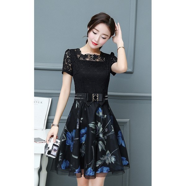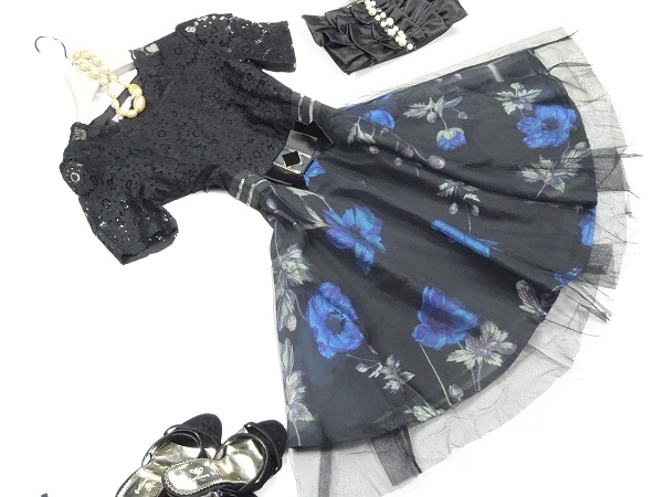 ボタニカル柄スカートチュールのワンピース。上半身は花柄の総レース仕様。スクエアカットの襟が上品な印象に。ウエストには大きな黒と金のバックルを配しアクセントに。スカート部分は下地が青系の花柄をプリントしたサテン地で、上に黒のチュールをかぶせた豪華な仕様に。ちょっとおしゃれな普段着として、またパーティやコンサート、結婚式の二次会にと、いろいろなシーンに活躍してくれる一着です。ベルトは縫い付けていて取り外しできません。右脇ファスナ-有。裏地有。