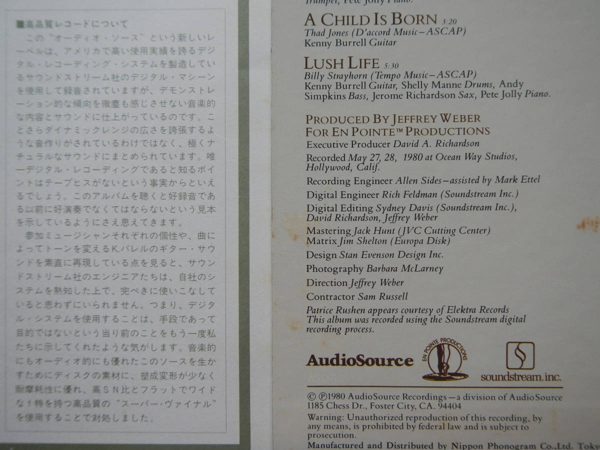 w)帯(裏面軽茶斑少々以外印象綺麗部類)、ライナー(軽茶斑若干以外印象綺麗部類)、米国製内袋(底抜/焼)。ジャケ裏面茶斑少々以外印象綺麗部類、盤印象綺麗部類/再生印象基本的にはアナログ当時盤不可避チリ音レベル/高品質スーパーヴァイナル盤特有音質満喫可能かと思います。