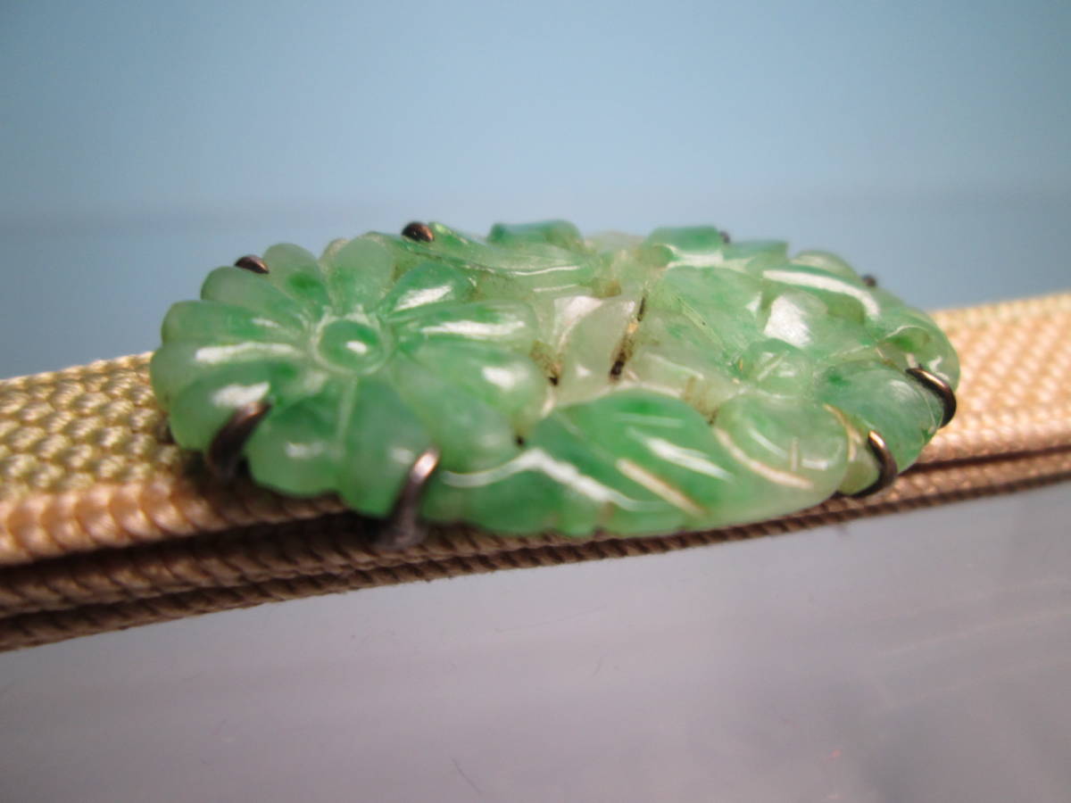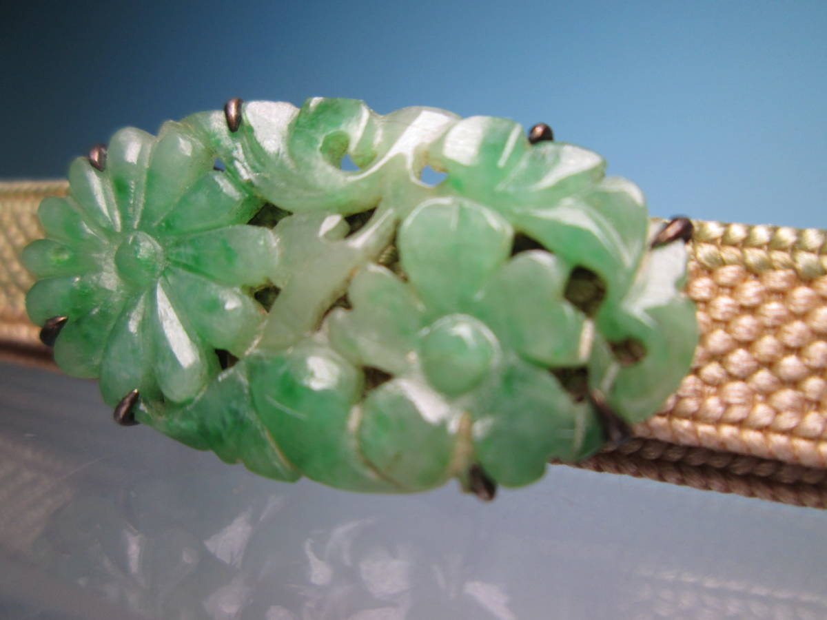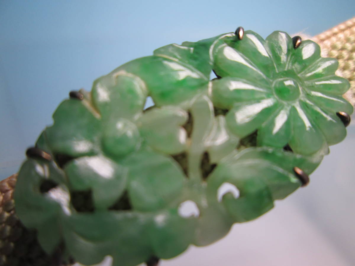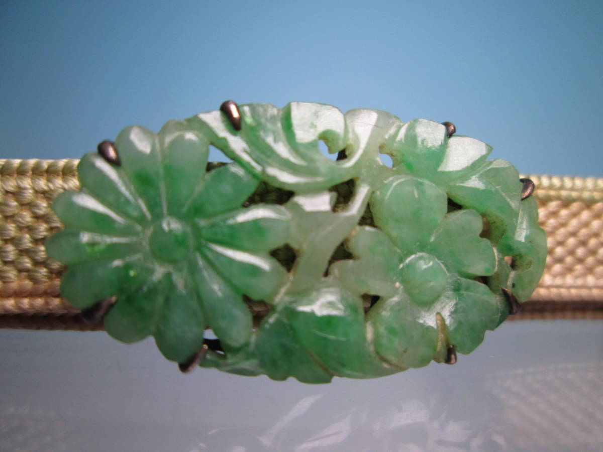 【江月】アンティーク・銀製 本翡翠 花透かし彫刻の帯留め