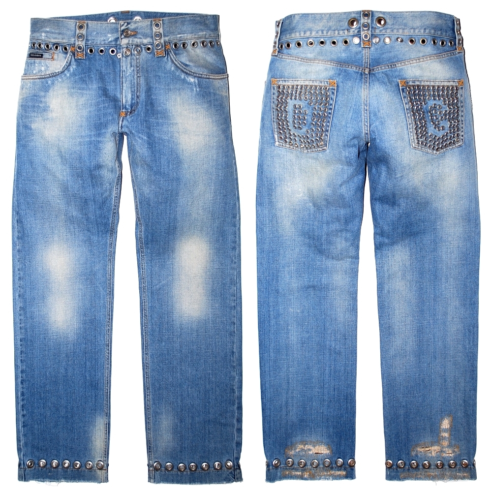2006年・春夏、ドルチェ&ガッバーナの、ハトメ・ジーンズです。 購入先は、ドルチェ&ガッバーナ・ニューヨーク直営店です。 日本国内・未入荷モデルで、オークションでも出品されたことは無いかと思います。 着用回数は、2回。 丁寧に扱ったので、状態は、大変良いと思います。 大型のハトメが、【ウエスト周り】と【裾周り】に、グルっと一周するように、打ち付けられています。 圧巻なのは、ヒップ・ポケットで、 【D】と【G】の文字を縁取るように、ブロンズ色の小型ハトメが、ビッシリと敷き詰められています。 近くで見ると良く分かりませんが、 遠くから見ると、【D】【G】の書体が、より鮮明に浮かび上がります。 ウエスト周りに、若干クラッシュ加工があるものの、大きなクラッシュ加工は無いモデルです。 驚くのは、裾で、 有り得ないくらい、細かい、ギザギザ稲妻ステッチ【WWWWWWW】が、施されています。 一見、引きずって、擦れた感じに見えますが、 ここまでの最強ステッチだと、履いていくにつれ、これ以上、裾が、擦れることは皆無です。 また、このステッチの1段・上には、 【クラッシュ】&【裏当て加工】が施されていて、こちらも、職人技の出来です。 (ここまで手の込んだ加工なので、裾上げは、実質、不可能です) 裏返した画像を含め、沢山写真を撮りましたので、画像を参考に、ご入札して下さい。 (高画質画像なので、表示されるまで、時間が掛かります) (全て表示されるまで、マウスをスクロールしないことを、お奨めします) シルエットは、太めの、【20 LOOSE】 着用時、下着は透けて見えてしまいます。 ポケットの裏地が白なので、白いアンダーウェアの着用を、お奨めします。 日本国内で、まずバッティングすることは無い、レアなコレクターズ・アイテムです。 | |
