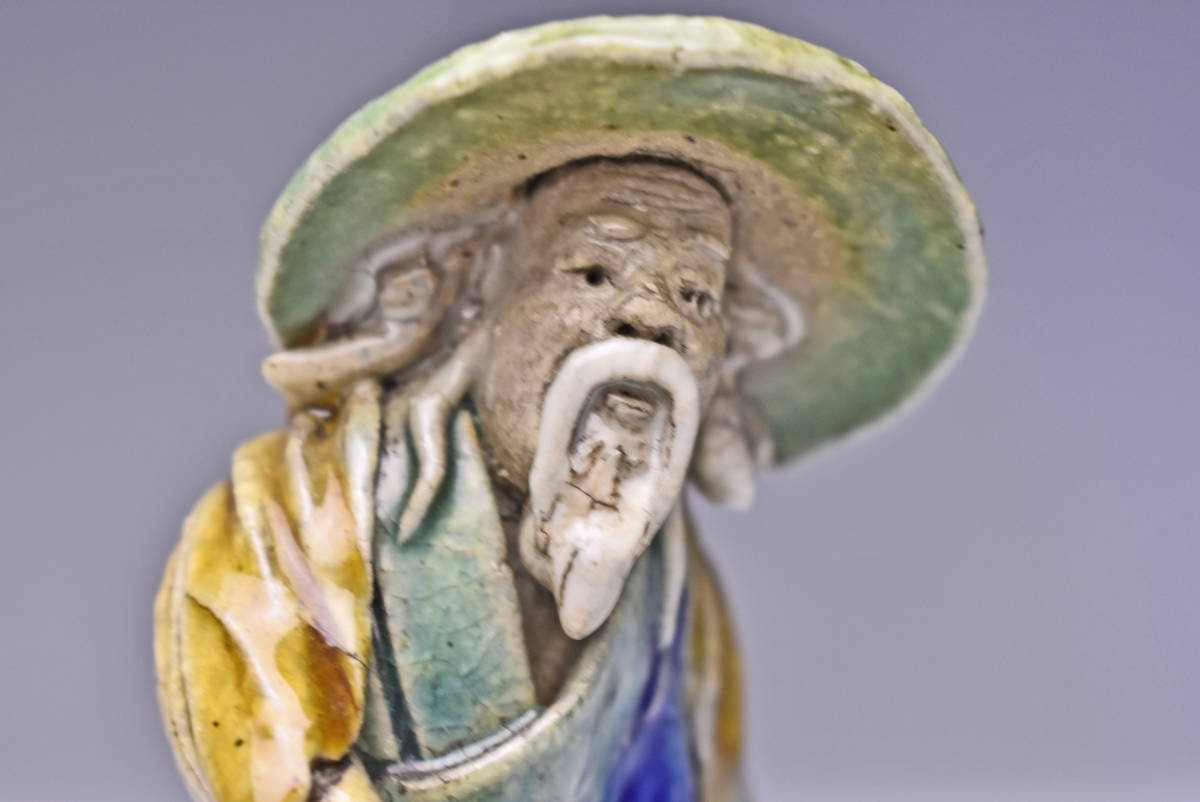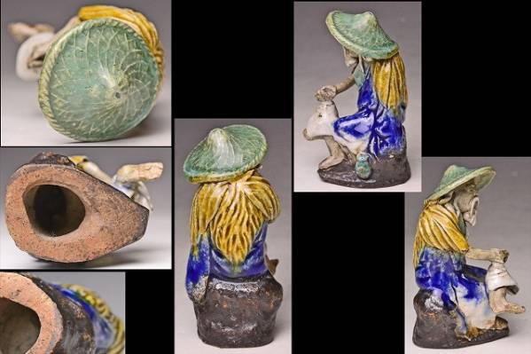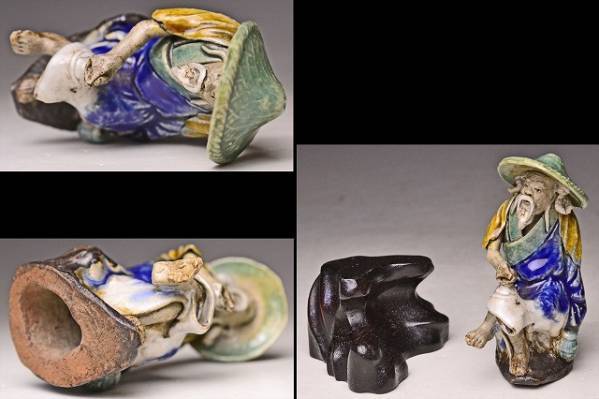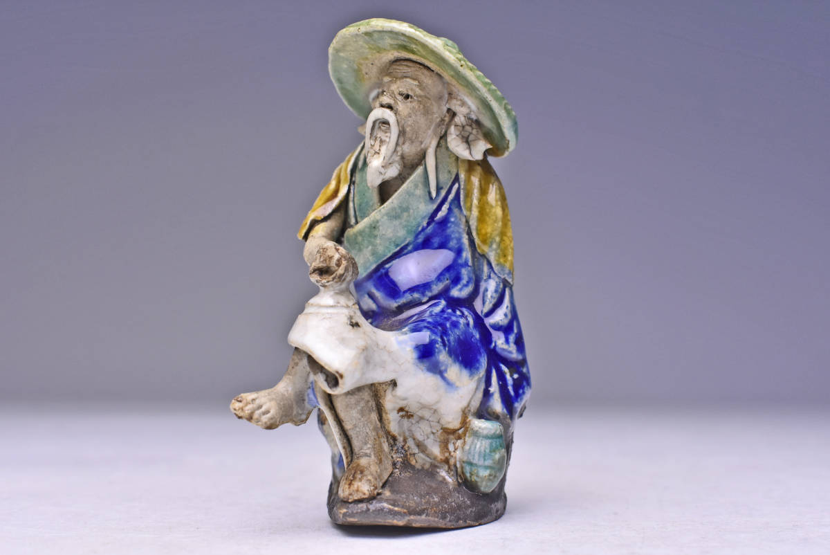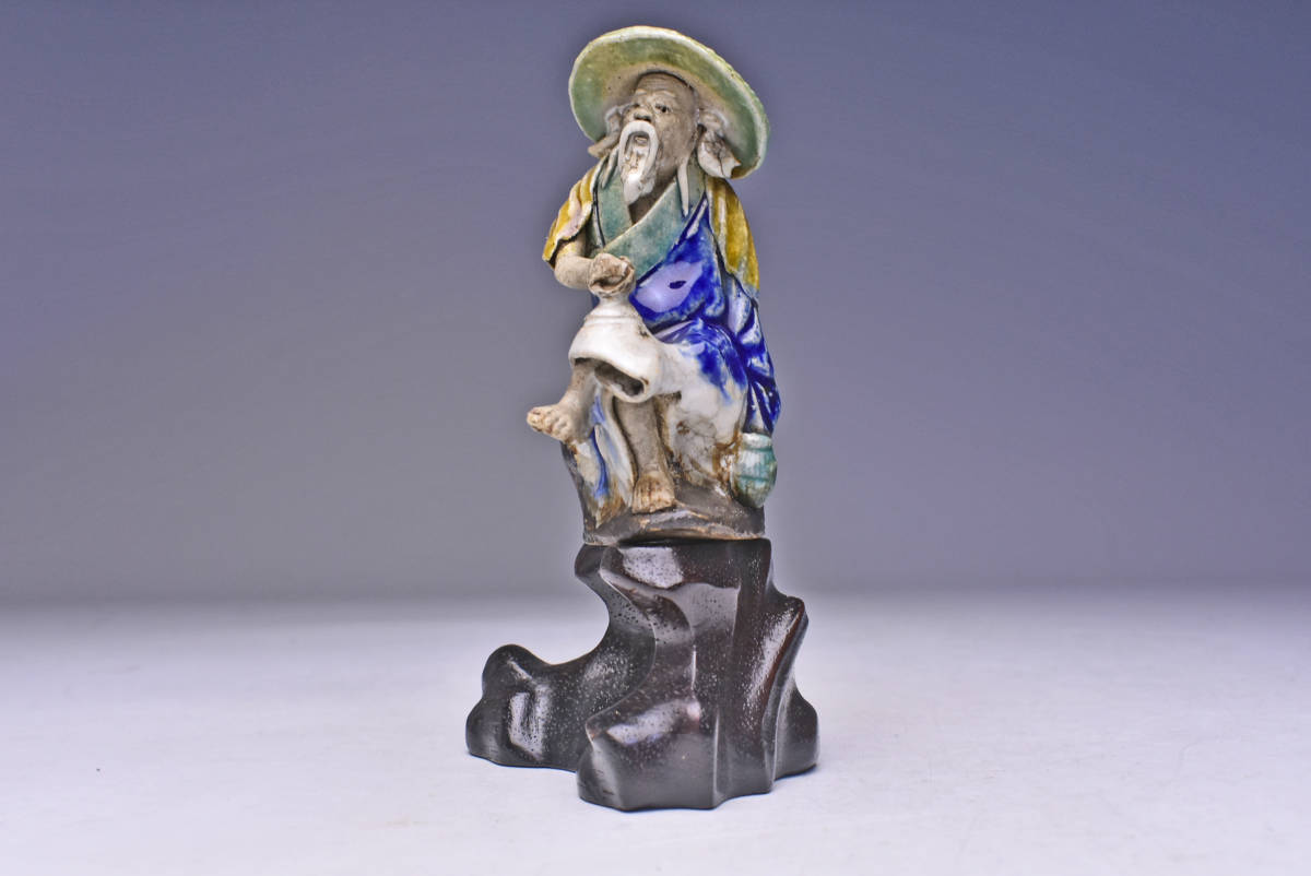 箱に清朝時代とある 作品です。 太公望? と思われる 陶器製の 作品で ピッタリではありませんが 味のある 唐木台 が 付いています。 高台にホツがあります。