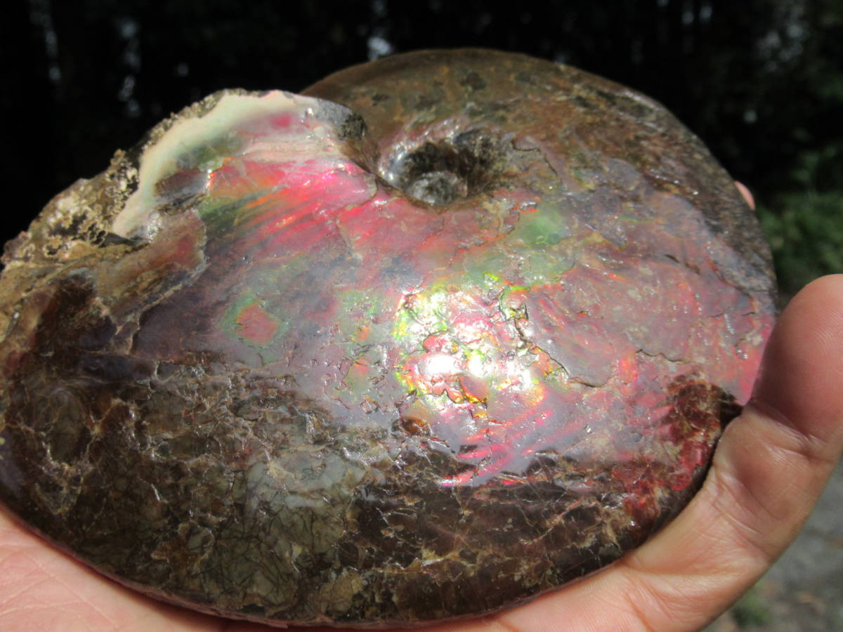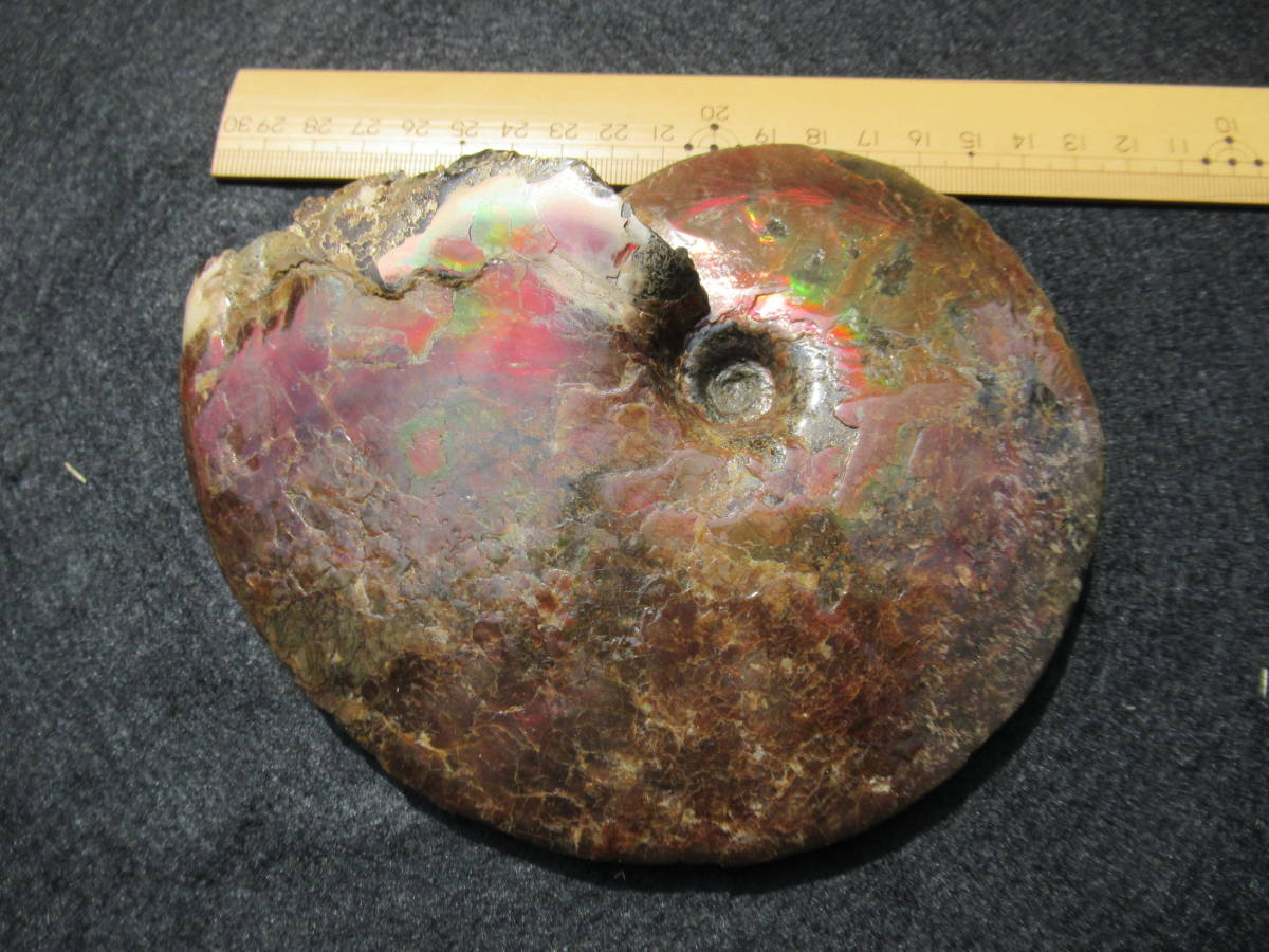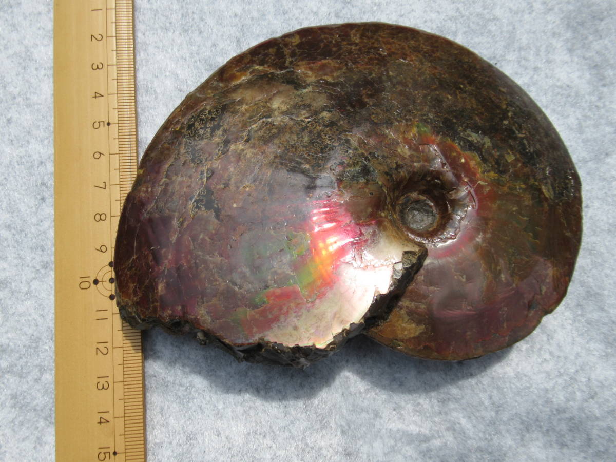 Sphenodiscus sp.Fox Hill Formation,late Cretaceus。アラゴナイト質の殻が残りオパールの様な虹色を呈するアンモナイト化石で、色調は赤と補色の緑が混在。一部の殻が薄い部分では縫合線が透けて見え、さらに殻が厚い後部の両側で殻の構造と思われる皺状の構造が見られます。最大差し渡し145mmほど。送料無料。