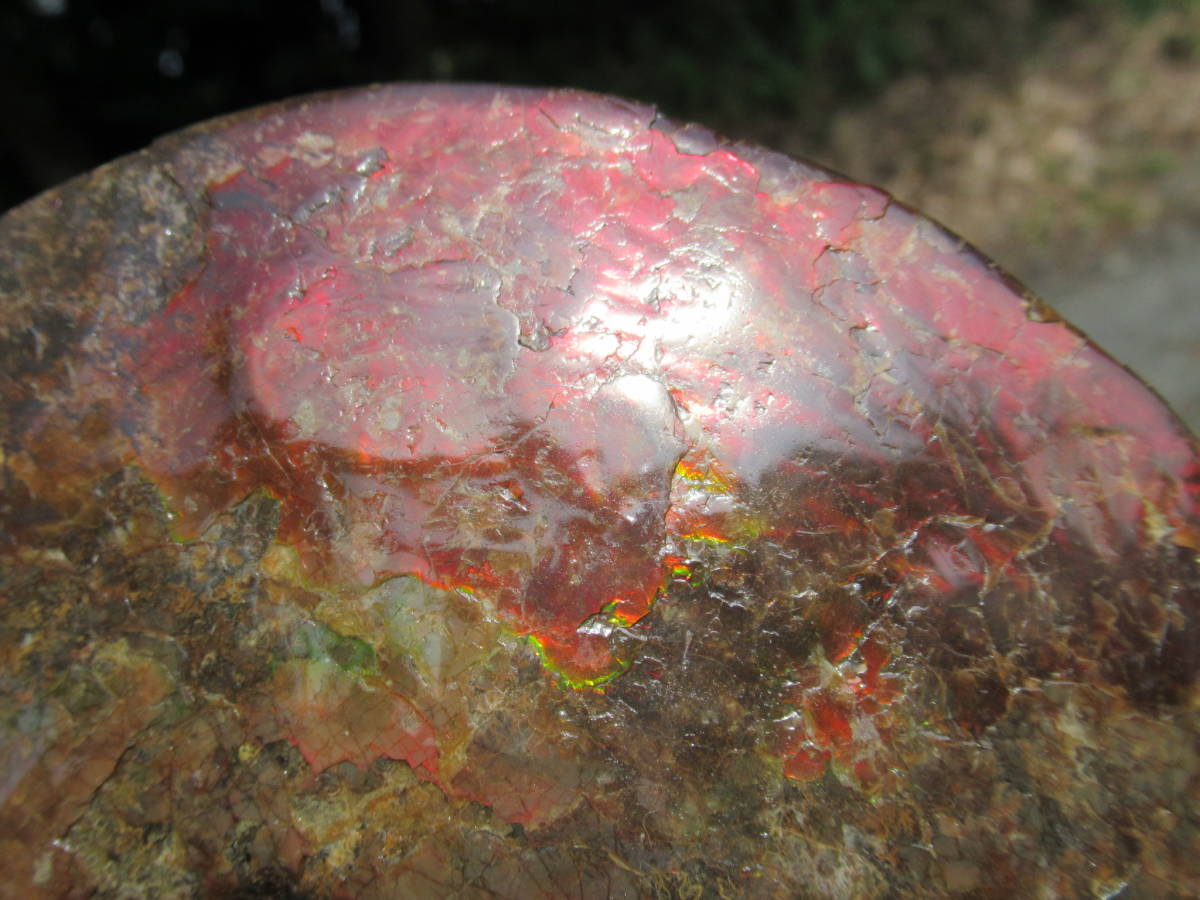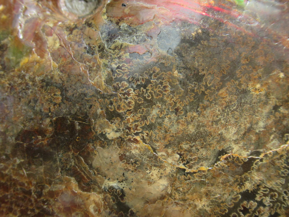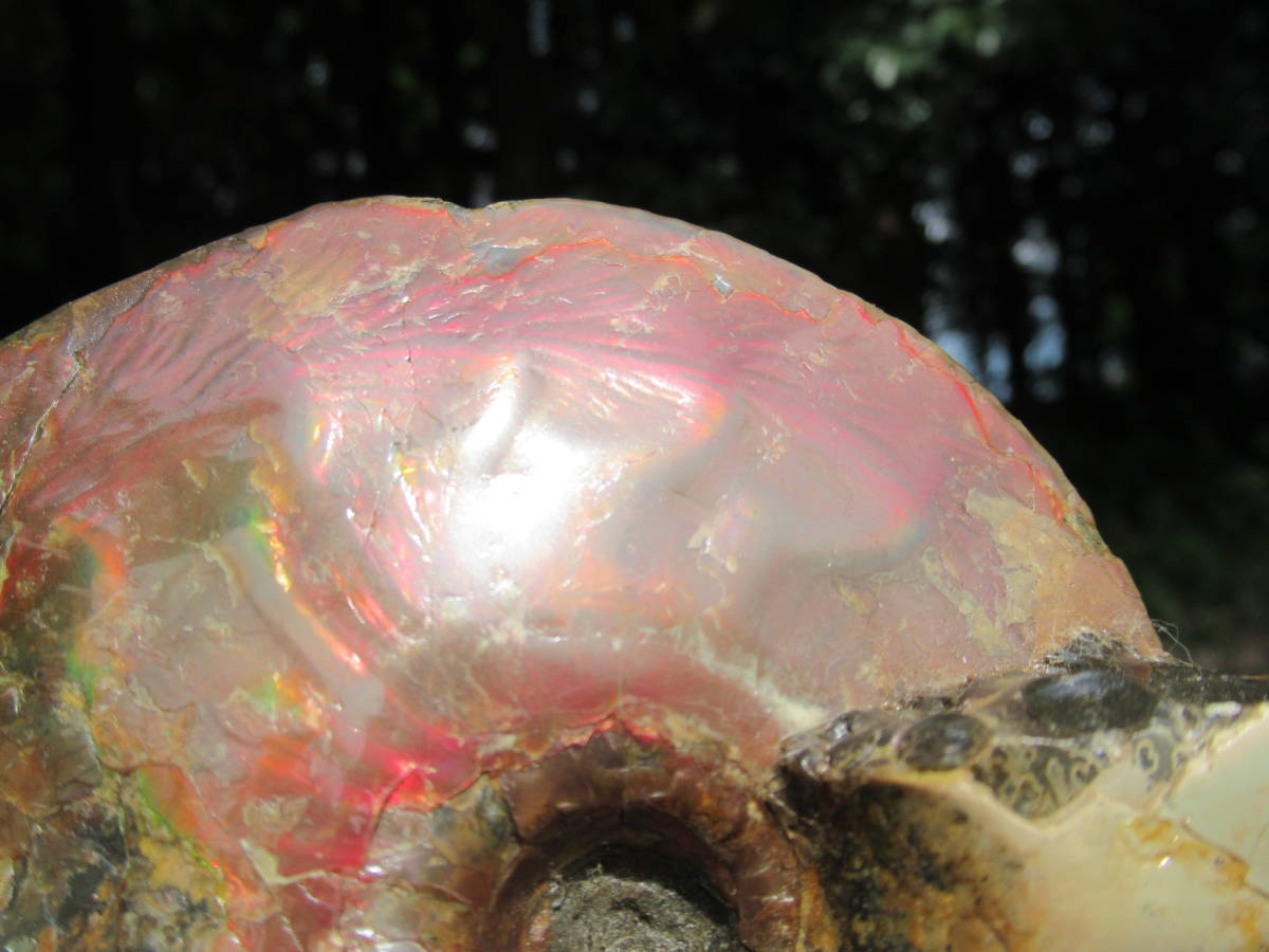 Sphenodiscus sp.Fox Hill Formation,late Cretaceus。アラゴナイト質の殻が残りオパールの様な虹色を呈するアンモナイト化石で、色調は赤と補色の緑が混在。一部の殻が薄い部分では縫合線が透けて見え、さらに殻が厚い後部の両側で殻の構造と思われる皺状の構造が見られます。最大差し渡し145mmほど。送料無料。