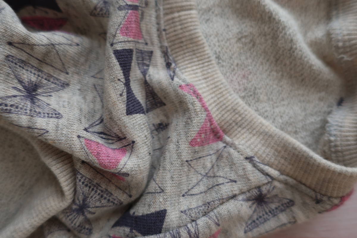 家庭用ミシンで作っているため、ニットの毛羽立ちがあります。