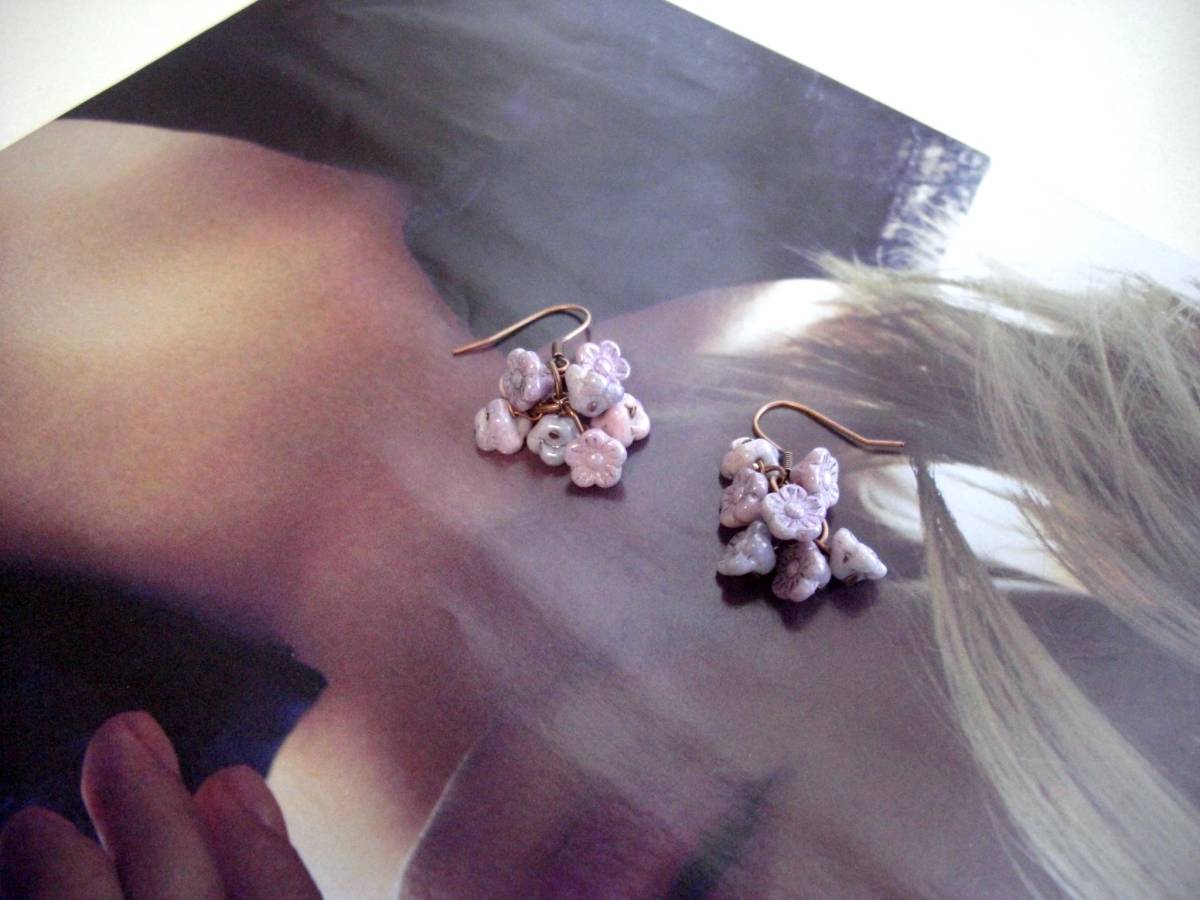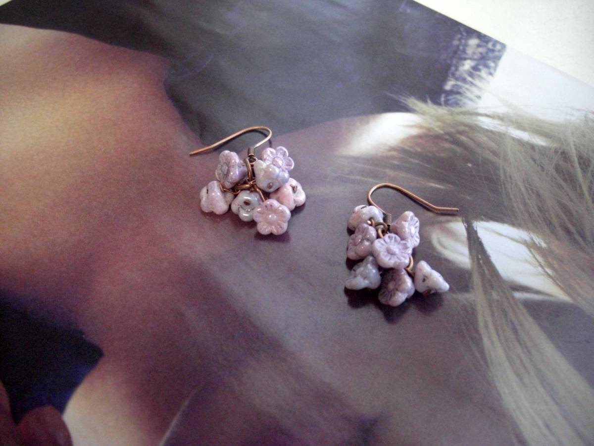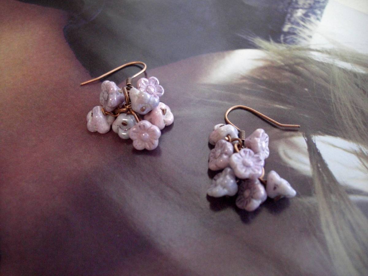 お気に入りを+して・・シリーズです♪儚げなチェコの小花を繋いで・・シックなグレーパープルやモーヴピンクのチェコのお花のピアスです♪小さなお花を集めてロマンチックな表情です♪チェコの小花は6×9ミリ位です♪長さは全長4センチ位です♪イヤリングに変更も出来ます♪お揃いのネックレスやブレスレットも出品しています♪シンプルで 飽きのこないいつまでも着けられるデザインを考えて作りました!ハンドメイドをご理解頂いてノークレーム、ノーリターンでお願いします