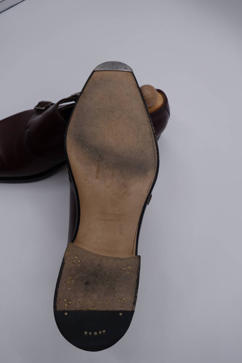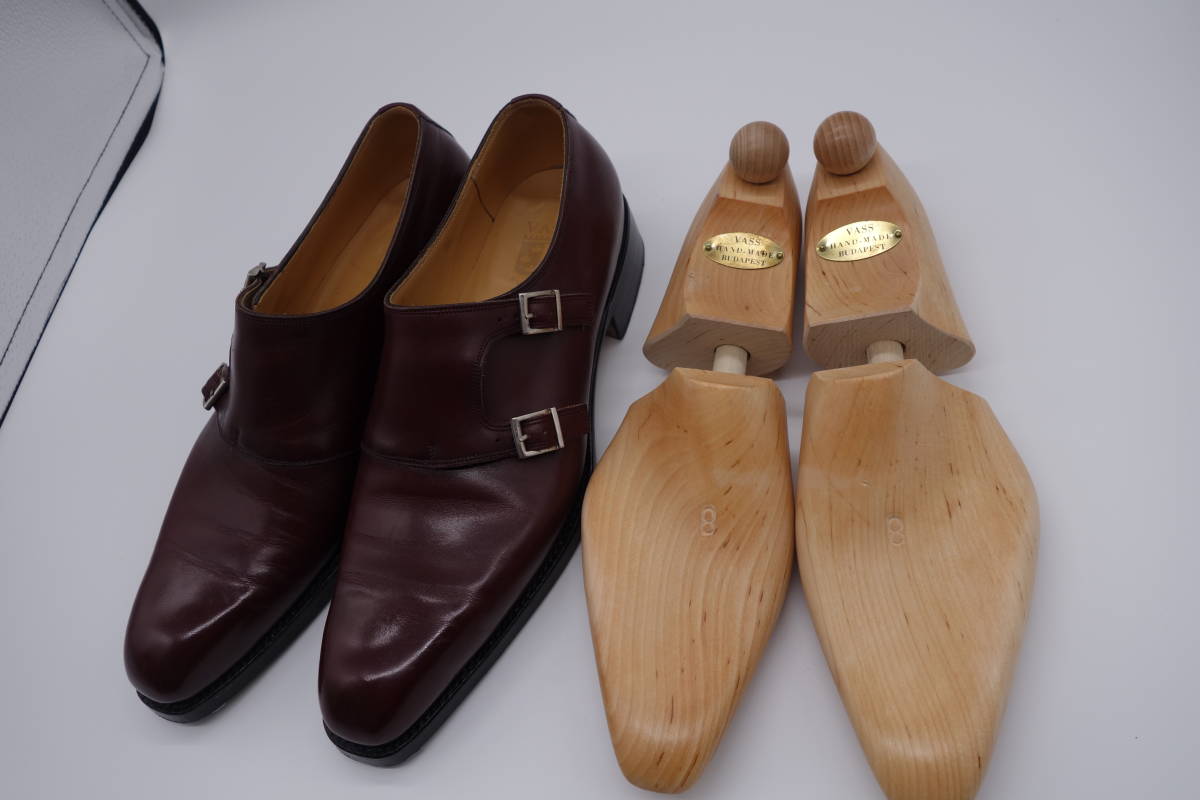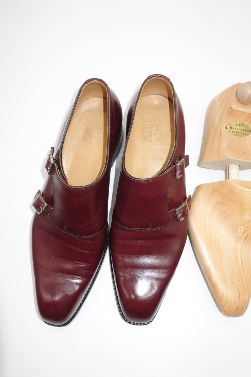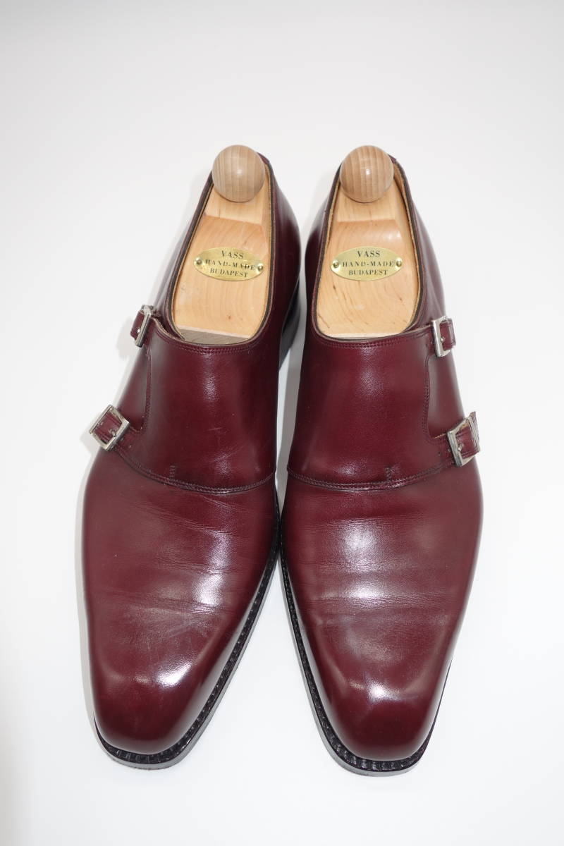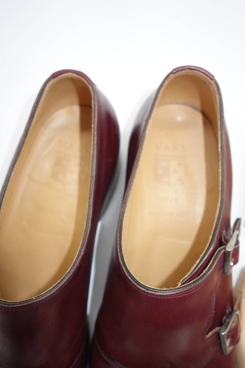 VASSのダブルモンクストラップです。イタリアの靴職人ロベルト・ウゴリーニとVASSのコラボモデルで、洗練された美しいデザインだとも思います。靴本体にサイズの記載が見当たりませんが、専用ツリーが付属していて、ツリーに「8」と記載があります。アウトソールの実寸は長さ約31cm、幅約10.3cmで、実寸からは8.5(日本サイズ26.5cm)くらいだと思います。ヒールの作りが小ぶりでカカトの収まりが良好で、非常に履き心地がいいです。当方、ジョンロブで8~8.5、エドワード・グリーンやクロケットで8.5を履いていますが、ほぼジャストサイズできつさは感じません。つま先にはトゥ・スチールを装着しています。雨天未使用、使用回数も4~5回くらいだと思います。特に気になるようなダメージは見られませんが、ノークレーム・ノーリターンでお願いします。発送は宅急便着払いとなります。