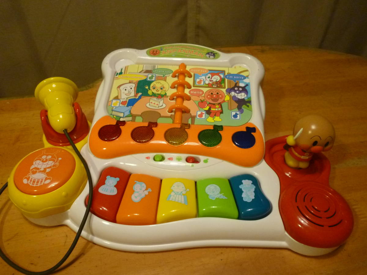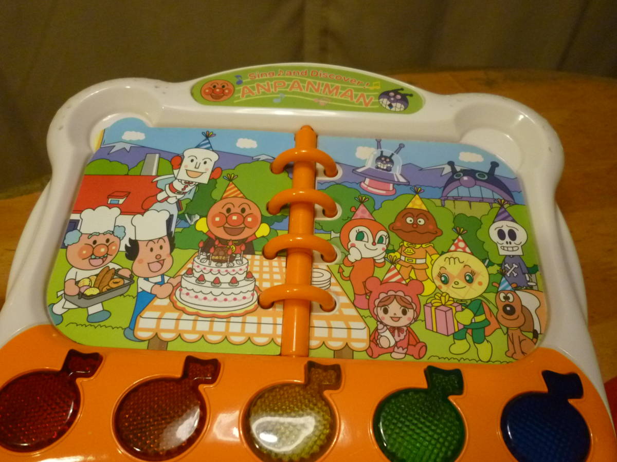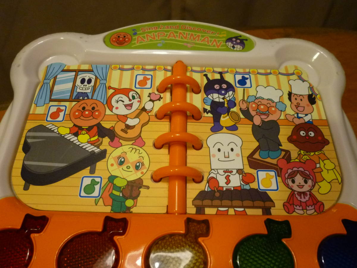 こちらはお子様が大好なアンパンマンで、シング&ディスカバーと題名があります。沢山の機能がある様ですがはっきりとした使い方は不明で当方の分かった範囲では、鍵盤上のスイッチをアンパンマン側へ入れると「ぼくと一緒に遊ぼうよ!!」等とおしゃべりが、それぞれの鍵盤を押すとその鍵盤にあるキャラのおしゃべりとその楽器を教えてくれ、絵本の英字のページでは♪ボタンを押すとそれぞれの色でその同じ色の印の付いたキャラが英語で話してくれ、鍵盤ではその色の英語と日本語名を、演奏会ページで♪のボタンを押すと、その色のボタンと同じ色の印のあるキャラのおしゃべりとその楽器名を教えてくれ、鍵盤ではそのキャラのおしゃぺりとその楽器での演奏が、パーティのページでは「一緒に歌おう!!」のおしゃべりが、♪ボタンはそれぞれにさまざまなメロディが、その時点で鍵盤を押すとそのキャラの声での合いの手が出ます。左のバイキンマンボタンでは又、別なおしゃべりや合いの手?機能が、右の指揮棒を持ったアンパンマンは前後左右に動かすと面白い音は出ますがその機能等ははっきりせず、又、スイッチの♪側でも同様に全体の機能もはっきりしませんので研究をお願いし、裏に使用の単三電池3本は別となります。