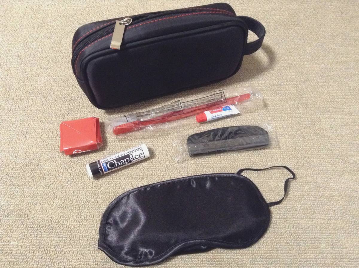 ①ビジネスクラス・アメニティ・ポーチ  おおよそのサイズ:横20X高10X幅5cm  歯磨き粉、歯ブラシ、櫛、リップクリーム、アイマスク、耳栓、以上の収納6品目は未使用品です。  コンディション:耳栓の香料がキツめで多少鼻につきます。