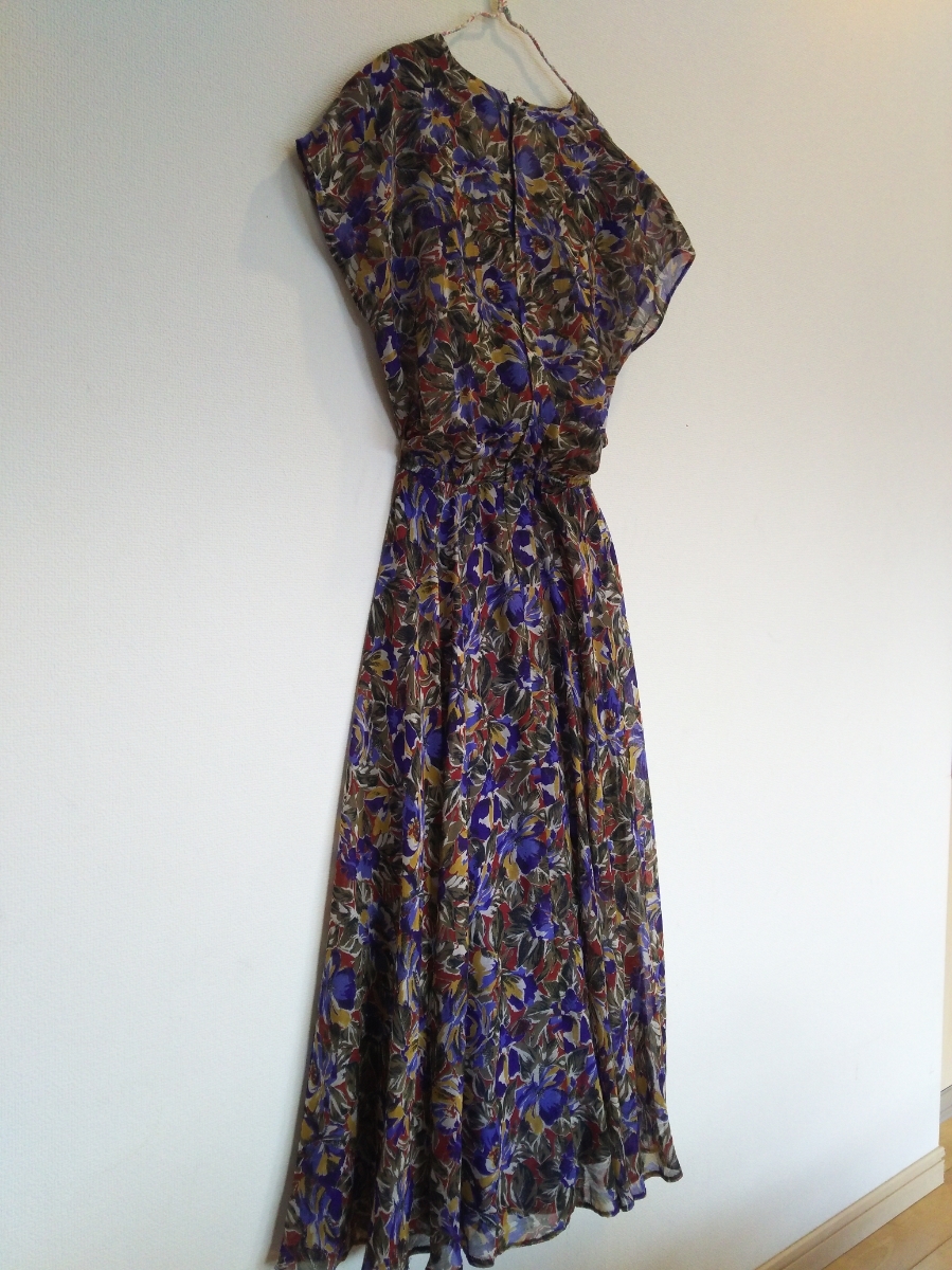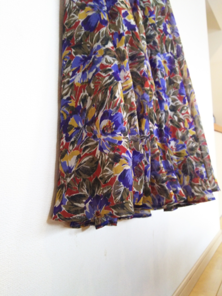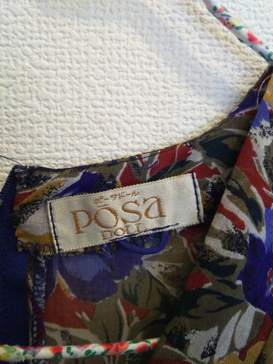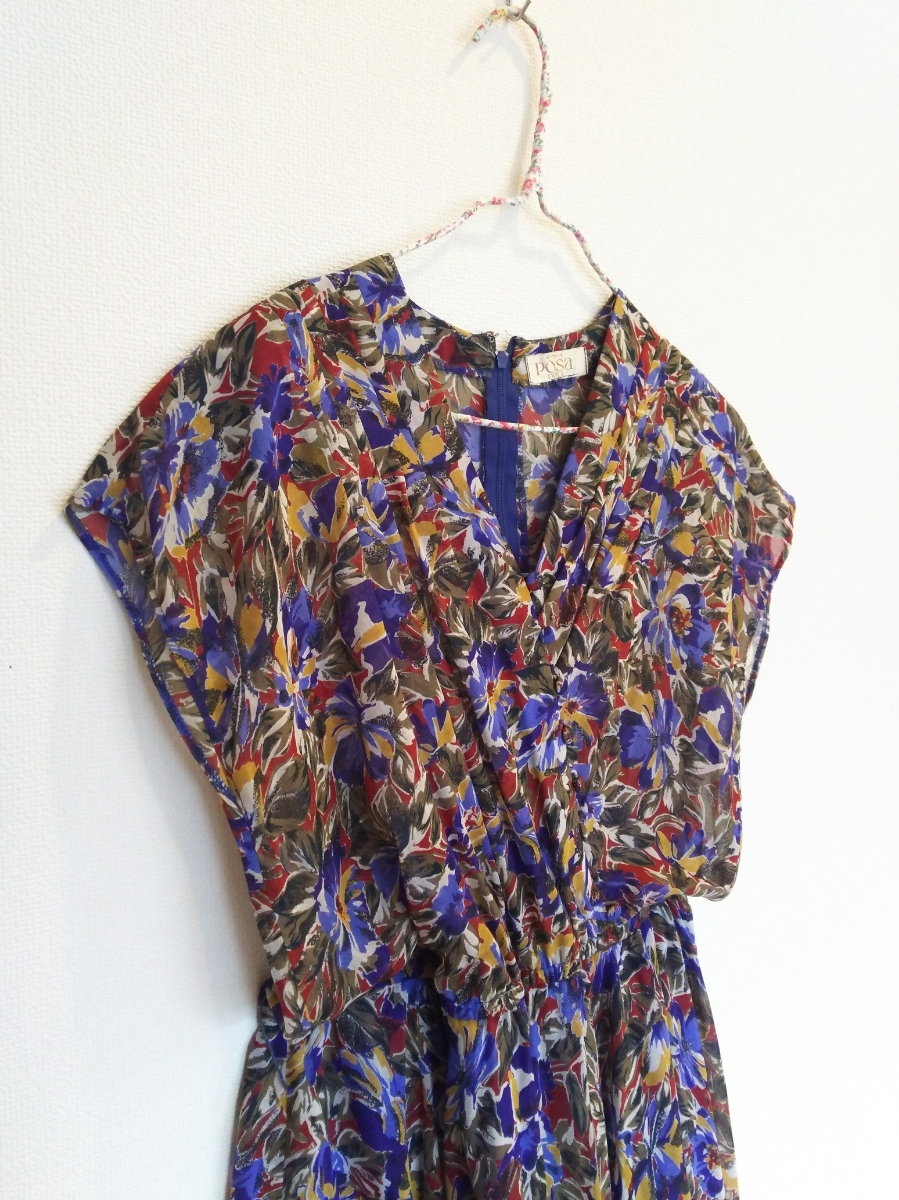 s448 希少 70~80年代 ■posa doll■ ポーサドール 日本製 総花柄 極薄フレアーワンピース 裏地付 肩パット付 Vネック 着丈112 身幅45