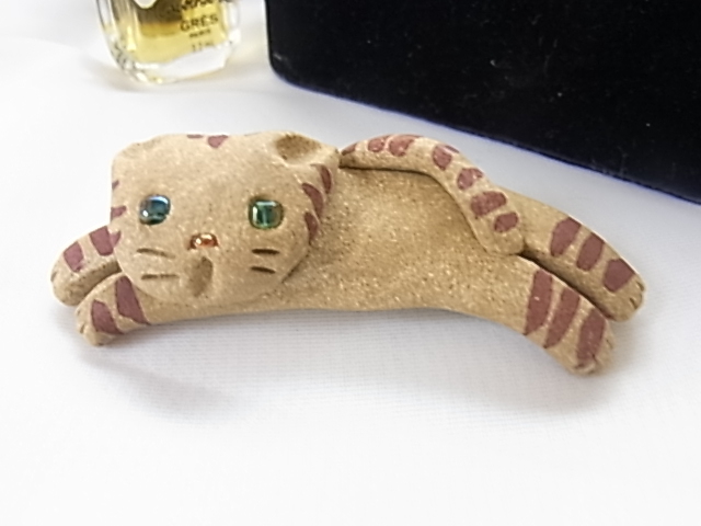 可愛らしい猫 キャット 目と鼻はビーズ ベージュ 三毛猫風 リラックスしたねこ ブローチ◇