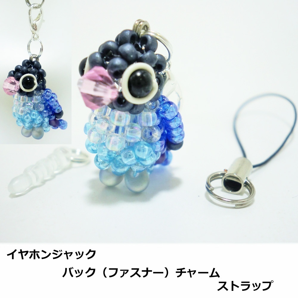 ボタンインコ・コバルトブルー ブルボ ビーズの小鳥★3WAY(ストラップ・イヤホンジャック・ファスナーチャーム)工房小鳥屋さん