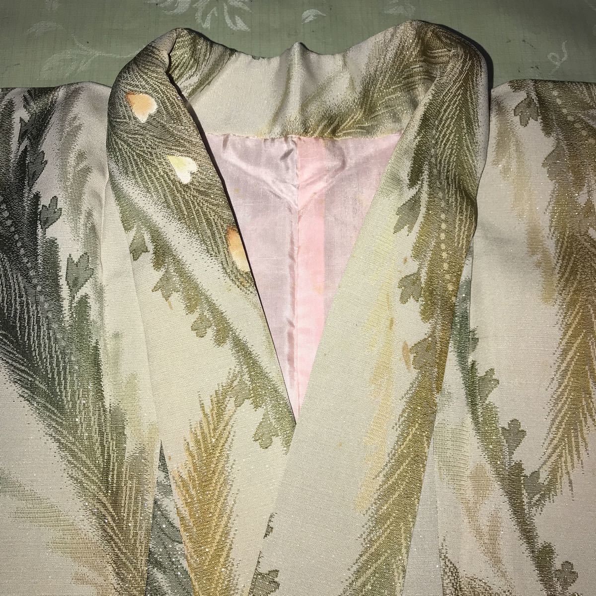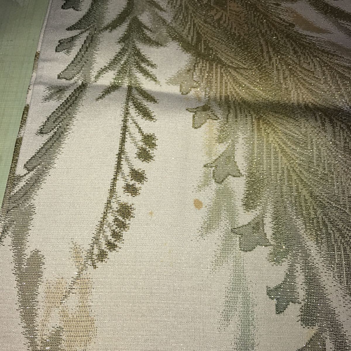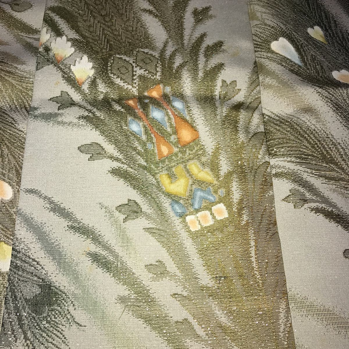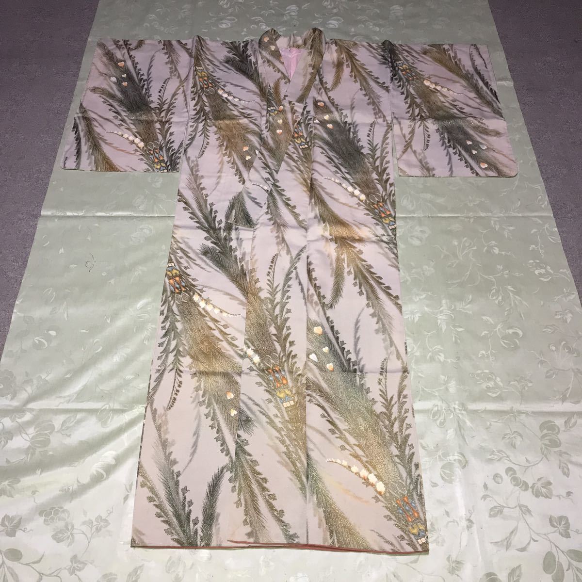 ■女性用 着物 シルクウール クリーム色地 深緑金色うす茶オレンジ ラメ入り リメイク用■
