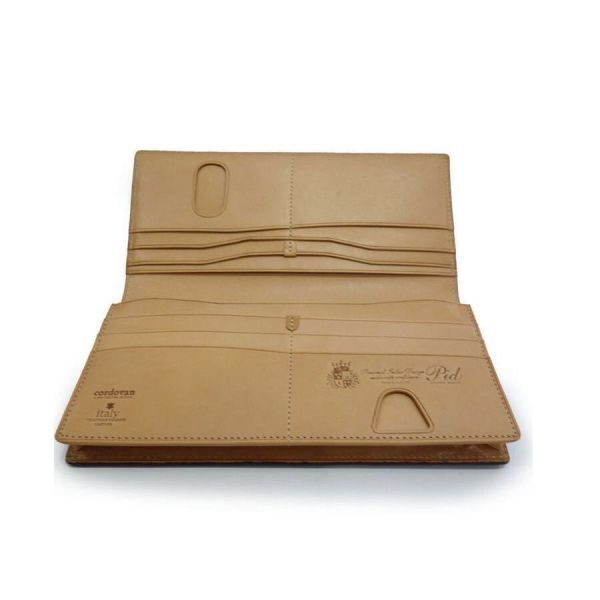 本体表に使われている革は、おもにフランス・スペイン・ポーランド産の原皮を使用し、日本国内で、ベジタブルタンニン(植物の渋)なめし&染料仕上げをされたコードバンを使用しております。染料仕上げは染料のみを使用する仕上げで、革表面に透明感を持たせ、革らしさを象徴する銀面模様が顕著に見られ、素肌のきれいな高級革の仕上げになります。日本に数社しかないコードバン一筋のタンナーでなめされ、表面加工されております。また、優れたコードバンに仕上げる為、なめしと表面加工は別々の優れた職人によって作られております。一般的な皮革はコラーゲン繊維が絡み合いながら横に走っているのに対し、コードバンはコラーゲン繊維が整然と縦に並んでいます。コードバン層はこのコラーゲン繊維の断面が表面組織となっています。整然と並んだキメの細かな繊維がむき出しとなった状態であるため、非常になめらかでしっとりとした質感が特徴です。インナーに使われている革はイタリア トスカーナ地方ピサにあるタンナーPUCCINI ATTAILIO社のベジタブルタンニンなめし革を使用しております。フルベジタブルタンニン(100%植物の渋なめし)&グルージング仕上げのヌメ革です。ベジタブルタンニン革は、イタリアの昔から継承されている特有の伝統的製法で手なめし染めです。時間をかけてじっくりとオイルを浸透させたこの革は、特有の匂い・使い込むほどに独特の色艶・浸透した油分が抜けにくいという特徴を持ってます。非常に手間と労力のかかる製法です。この製法で作られた革は傷もつけば色落ちすることもありますが、その反面使い込む程に傷も薄れ手脂や水(雨)などにもまれ時間をかけていくと革の艶が増してきます。