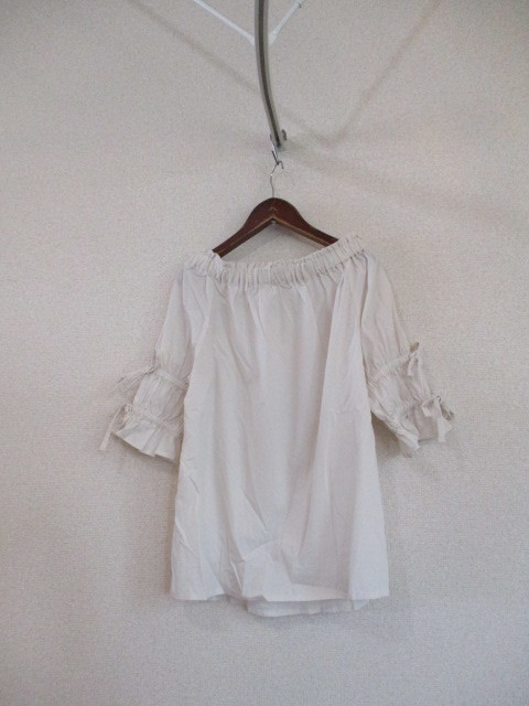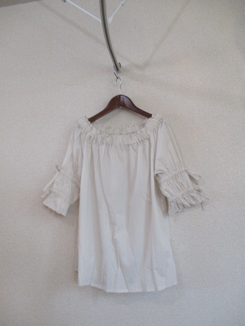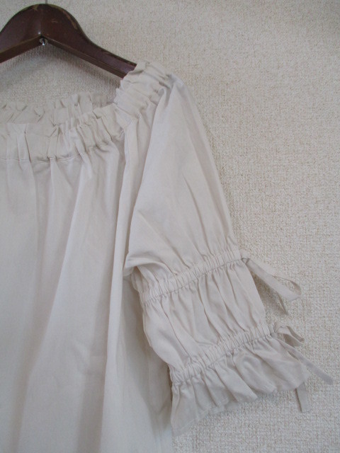 商品紹介 | きなりの5分袖ブラウスです。 襟元は少し横に広がりがあり、ゴムでギャザーが入っています。 袖にも2か所、ゴムでギャザーが入っていて、上をリボン結びするデザインです。 《素材》 綿100% |
