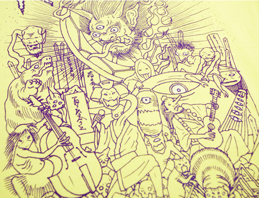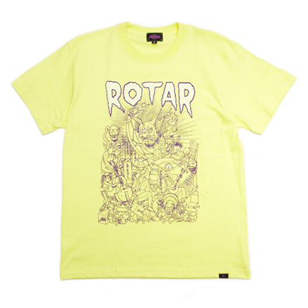 | ローターのTシャツ 貴重な中期の作品になります。 妖怪達がギター、ウッドベースなどを演奏しているローターならではのプリント。 ROTARの文字、妖怪の目は蓄光プリントになっています。 裾にピスタグ付き サイズ M |