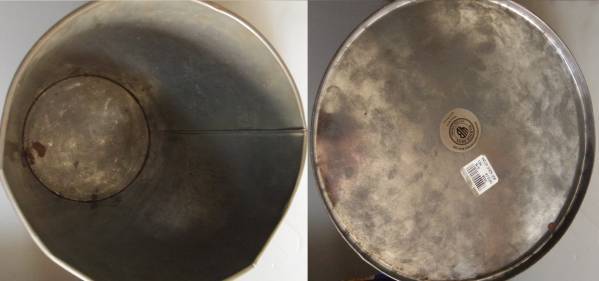 1990年代に、ワーナーブラザーズスタジオストアで販売された鉄製のゴミ箱です。ルーニーテューンズのキャラクターが100種類近く登場するデザインです。 大きさは直径26.3cm、高さ49cmです。 上部は凹みの製で綺麗な円ではなくなっています。胴部分にも凹みや傷があります。特に内部の汚れや傷、サビは目立ちます。 | ||||||||||||||