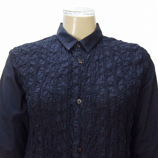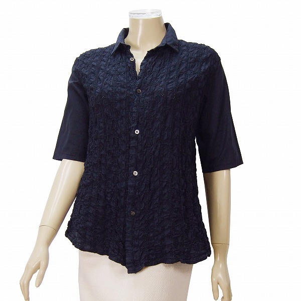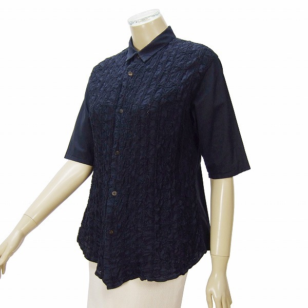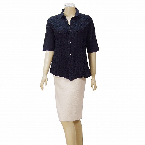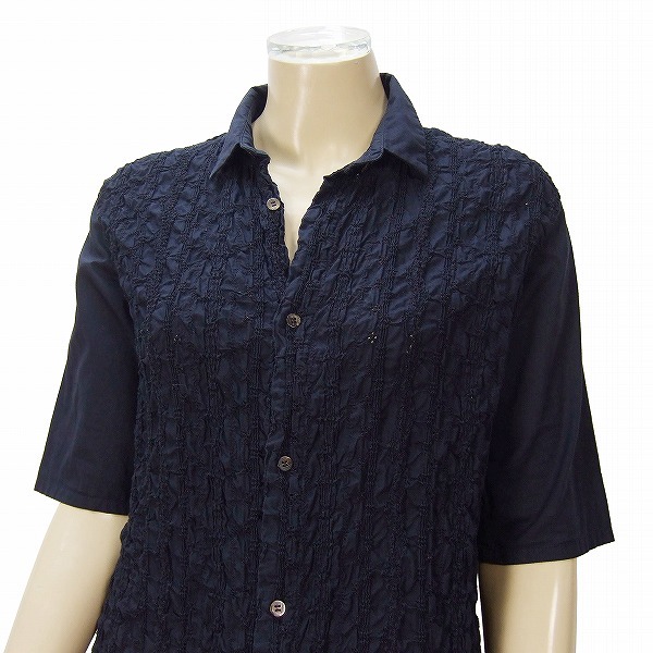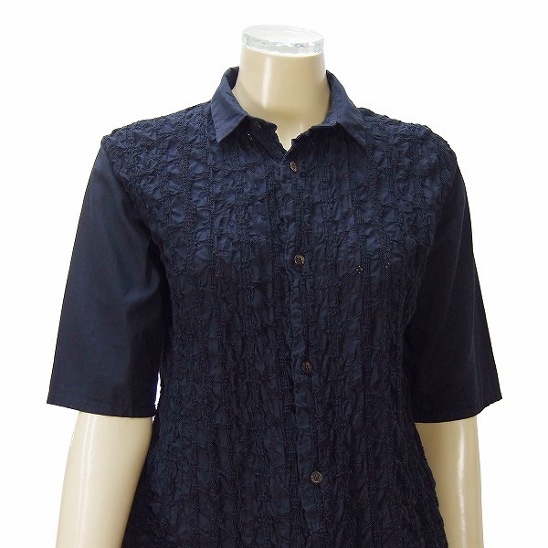 **・゜お洒落なシャーリングデザインの上級コットンシャツジャケットです。薄手の綿ローン風(綿100%)浅黒に近いシックな濃紺系薄手生地(僅かな透け感がございます。)コンパクトな衿デザイン×沢山のゴムで描かれた贅沢シャーリング(ゴム刺繍)ストライプ柄を前身頃全面に施した素敵なデザインです。半袖よりやや長い5分袖風×前裾アールシルエット×背中中央ボックスプリーツ入りの知的でエレガントな上級シャツジャケットです。.。*:.。