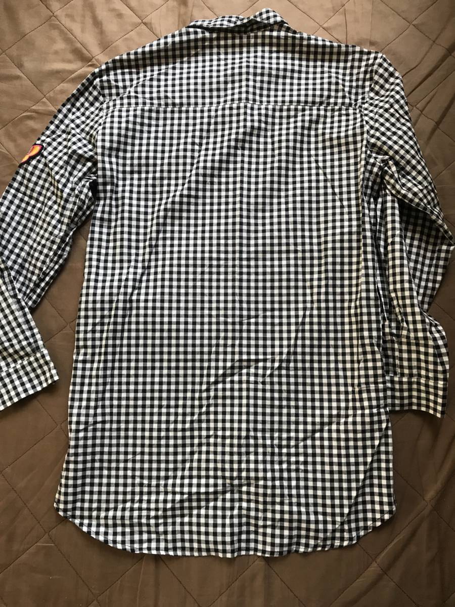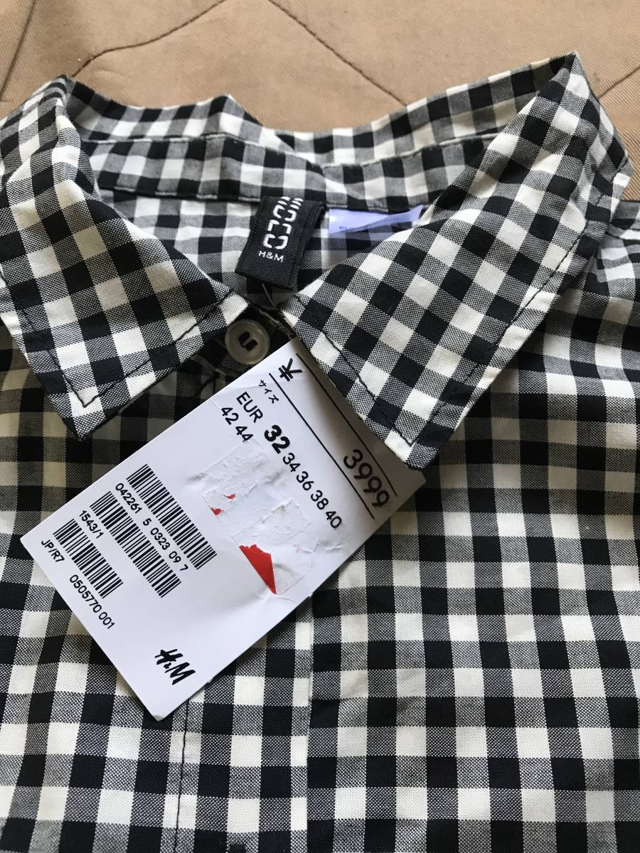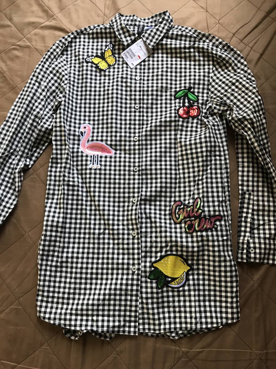 チェックのシャツに、可愛いアップリケがたくさん付いてます。