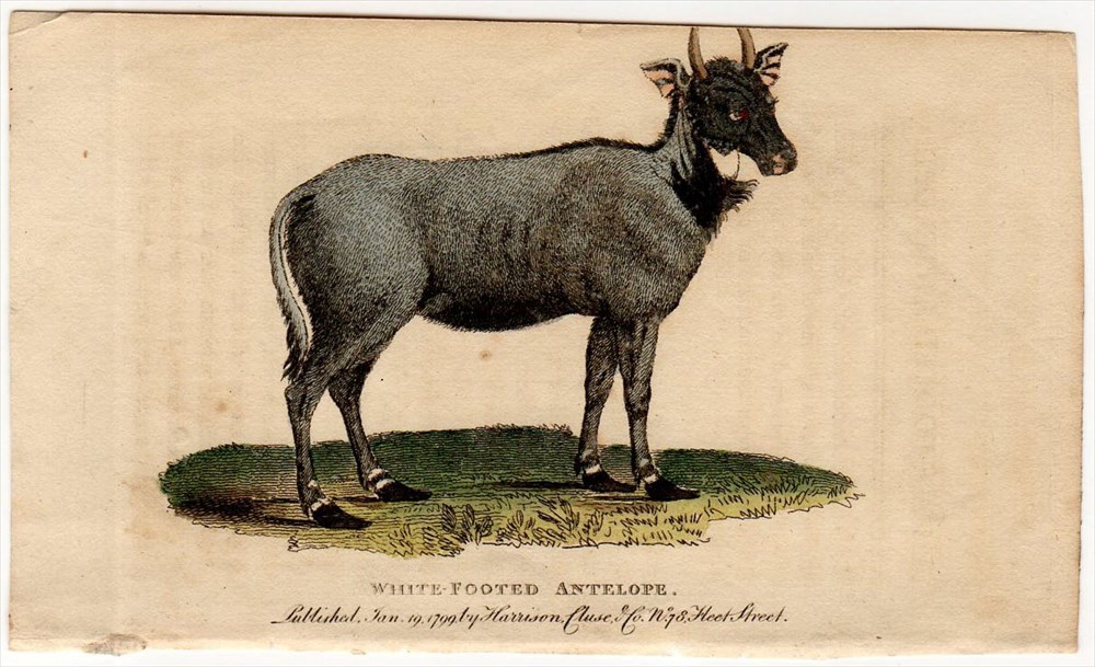 1799年 Naturalist's Pocket Magazine 銅版画 手彩色 ウシ科 ニルガイ属 ニルガイ WHITE FOOTED ANTELOPE 博物画