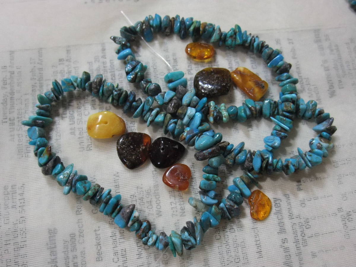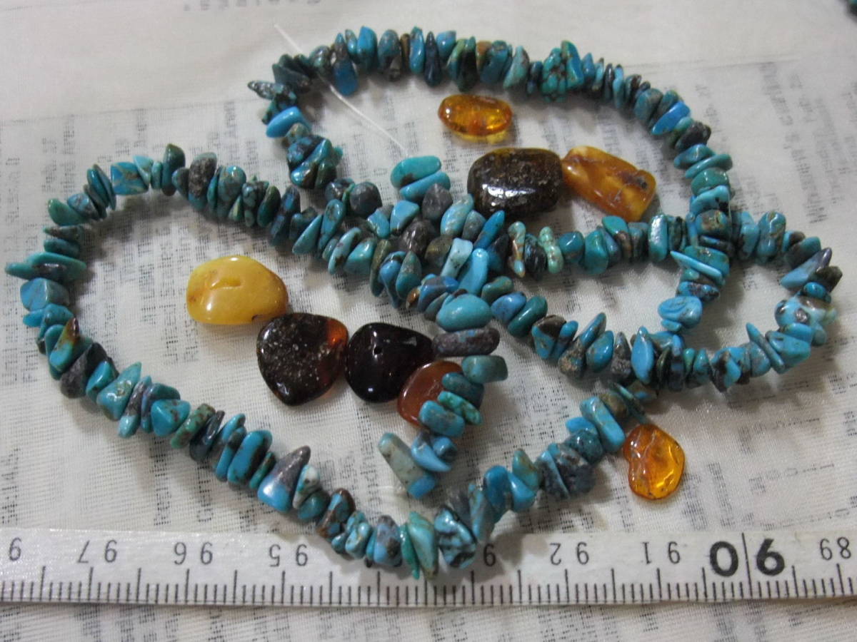 本ターコイズ本トルコ石アメリカ産と本琥珀平タンブルルースセット♪本琥珀のルースは一番人気のハニカム色も必ず一つは入ったお得なセットです♪ターコイズはなかなか高品質な小粒の薄平さざれ系の本ターコイズ連材で、人気のアメリカ産の約40cm1本です☆古いものですが本琥珀のフリーシェイプ平タンブルも♪このお値段なら初心者の方でも気軽に本物で製作できる、リーズナブルで安価なお薦めセットです☆
