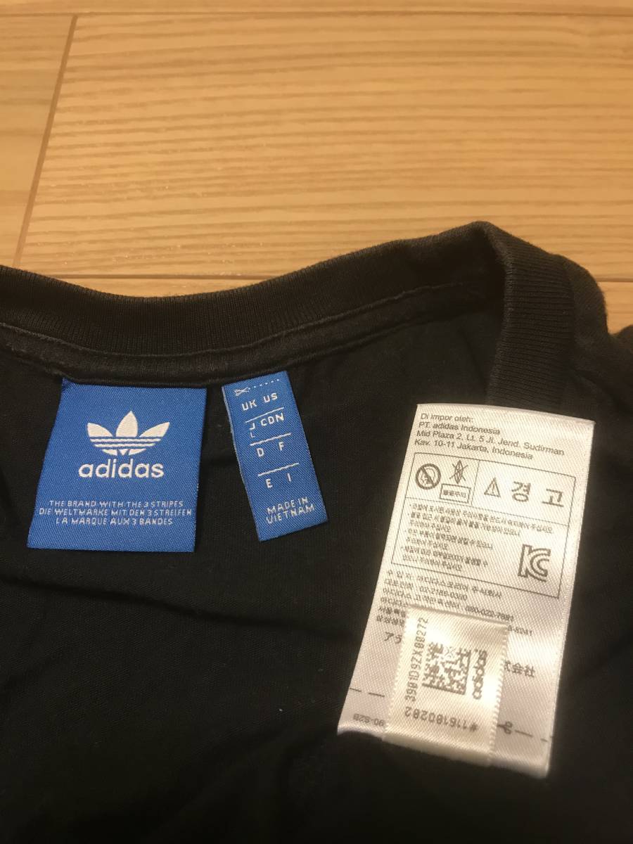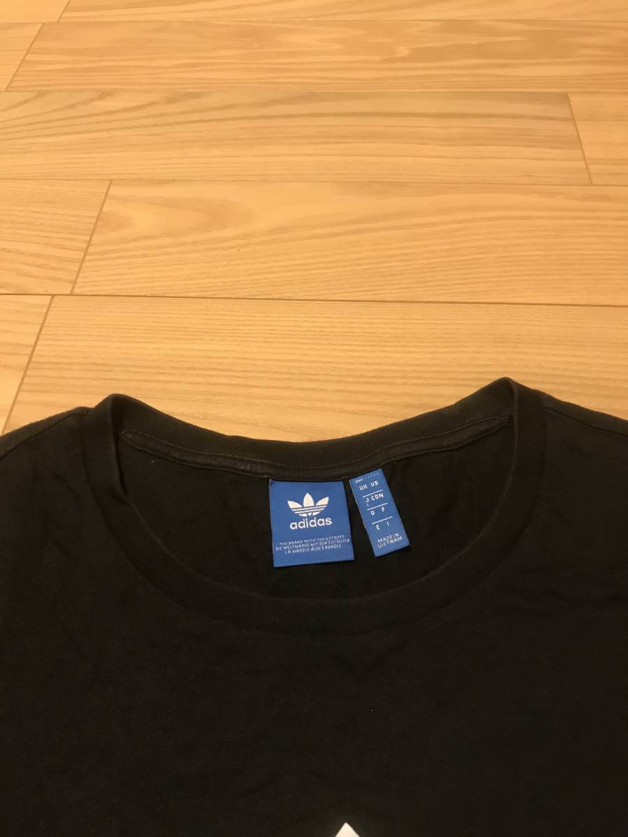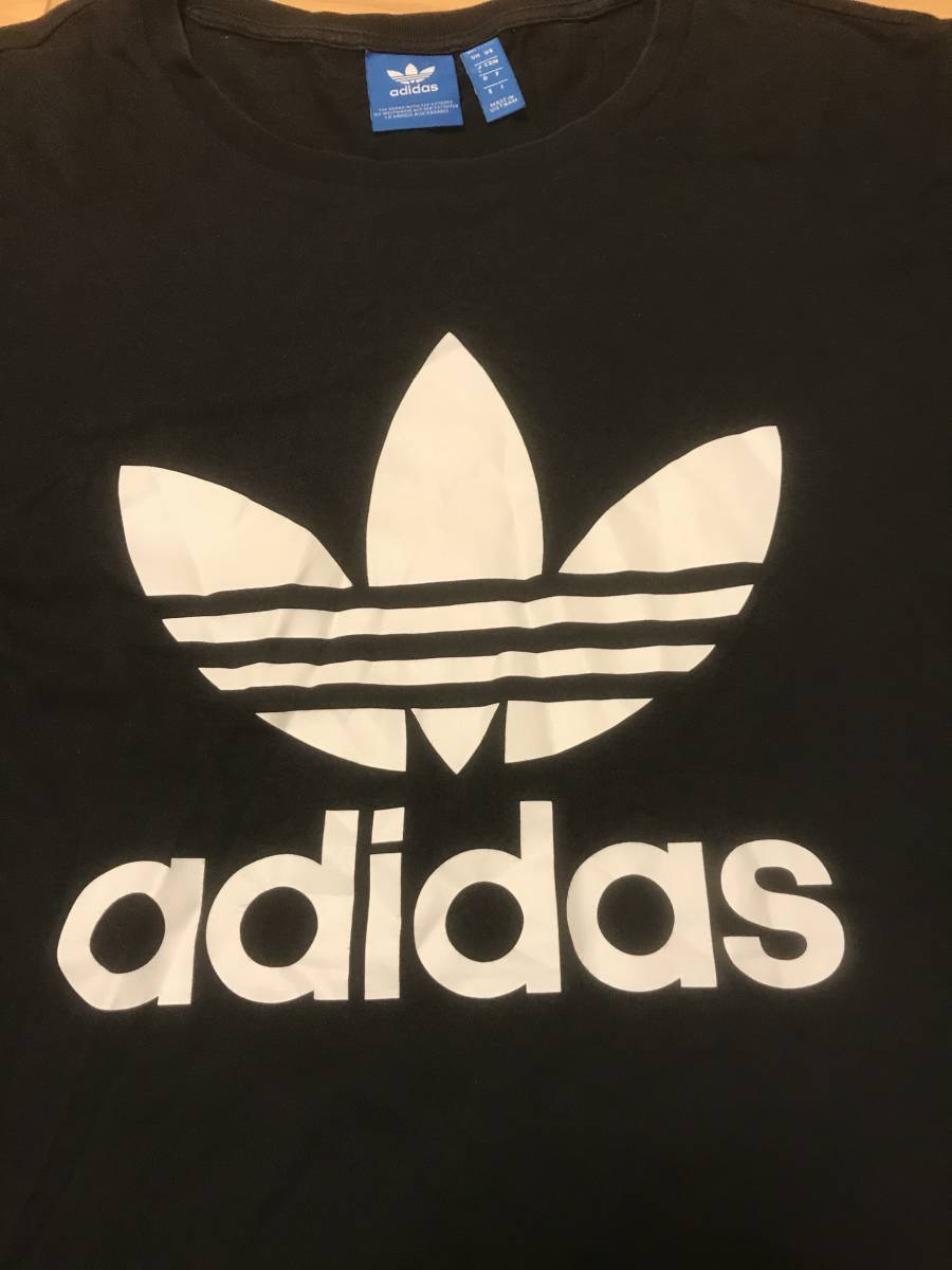 正規 良品 adidas アディダス ビッグロゴ 三つ葉マーク トレフォイルプリントTシャツ サイズL小さ目 細身 ブラック×ホワイト 黒×白色