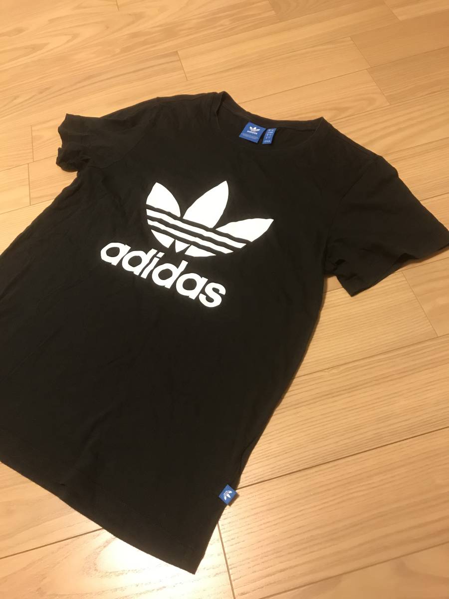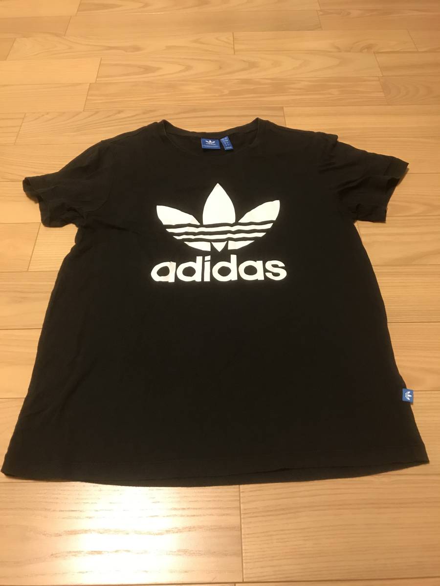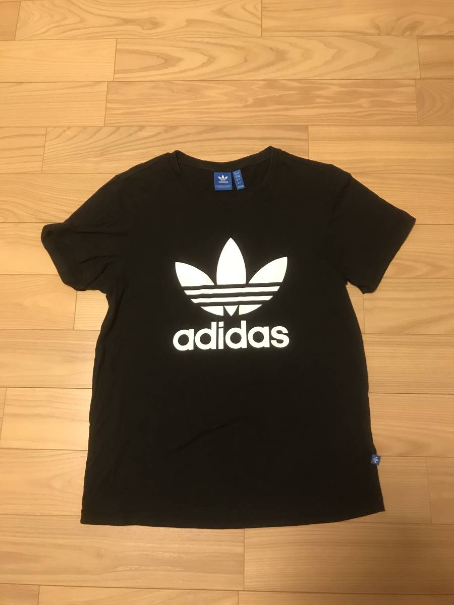 正規 良品 adidas アディダス ビッグロゴ 三つ葉マーク トレフォイルプリントTシャツ サイズL小さ目 細身 ブラック×ホワイト 黒×白色