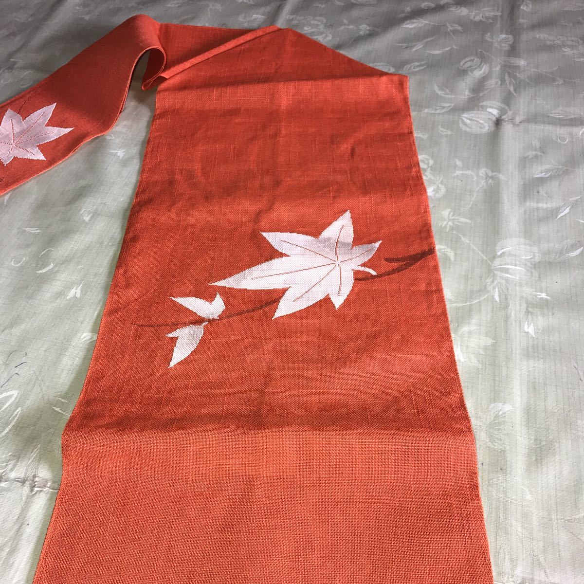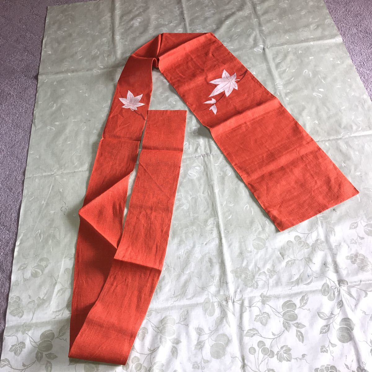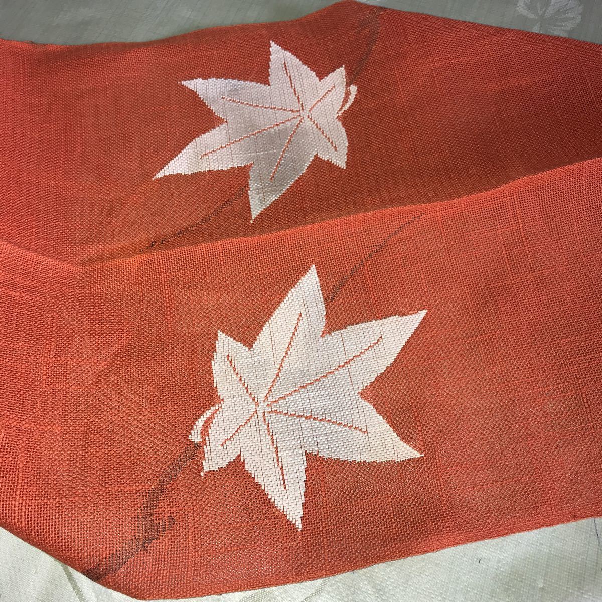 ■女性用 なごや帯 麻 赤オレンジ地 白もみじ?■