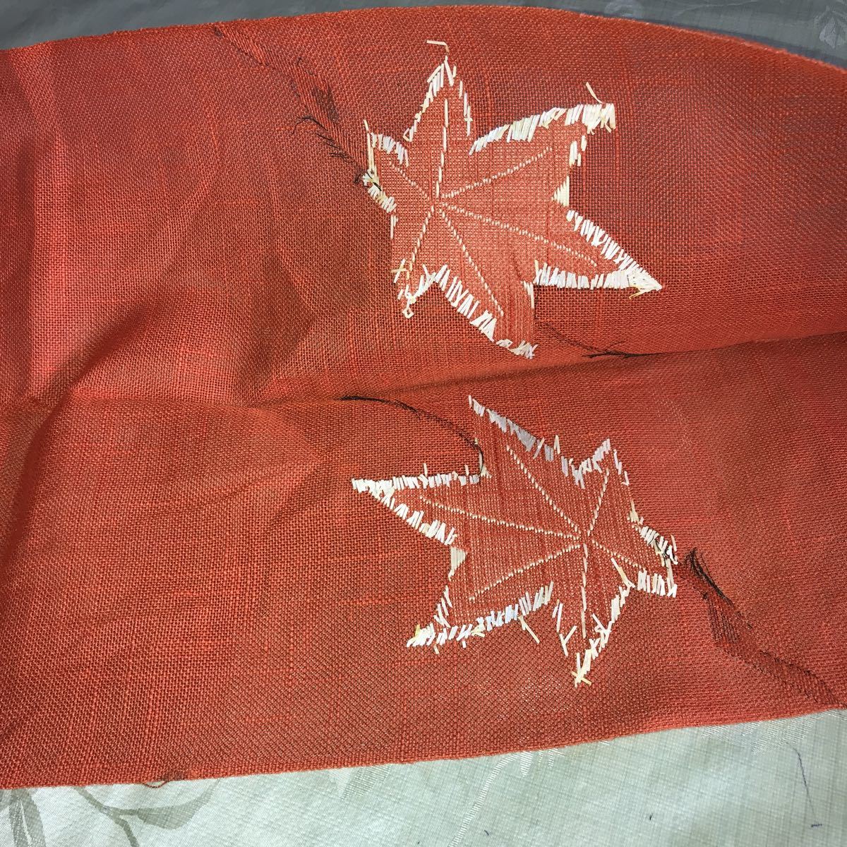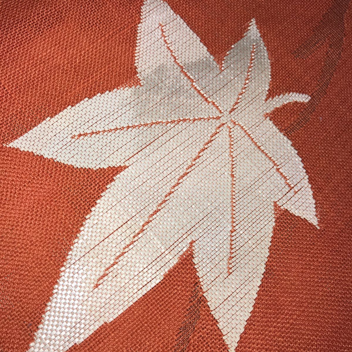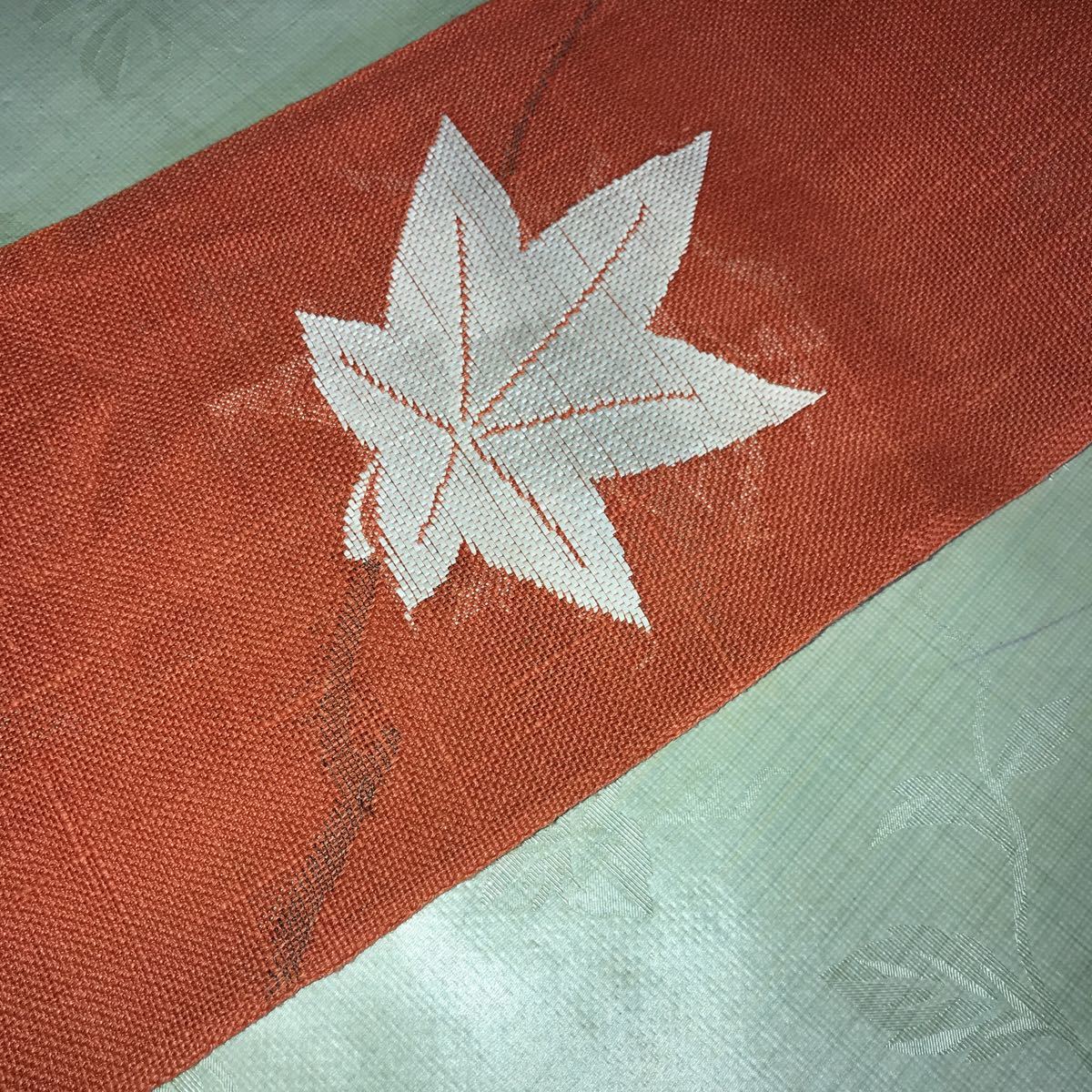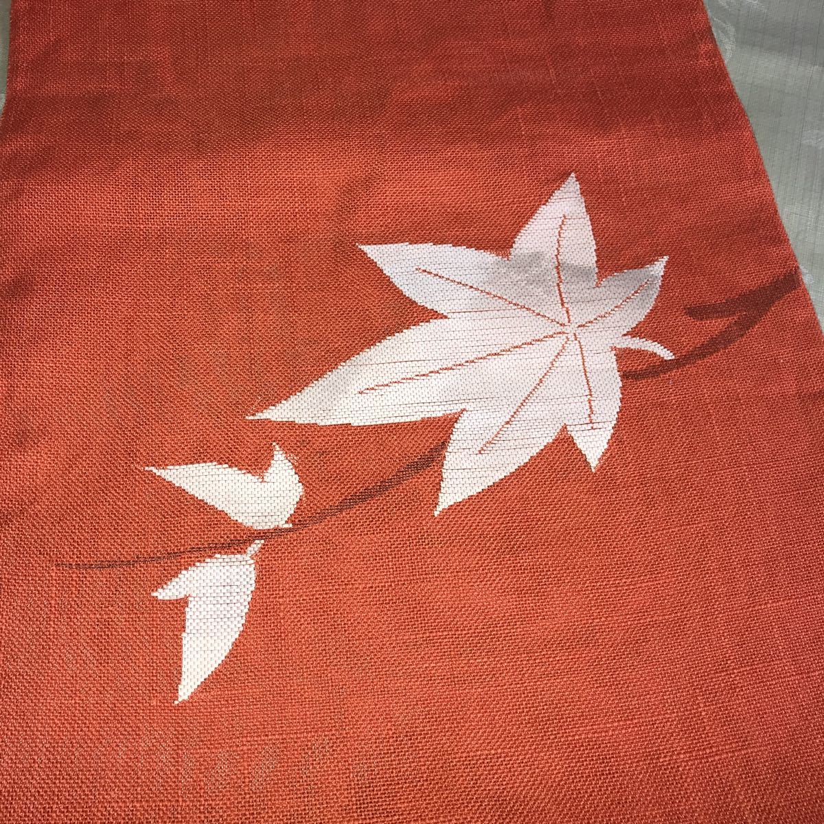 ■女性用 なごや帯 麻 赤オレンジ地 白もみじ?■