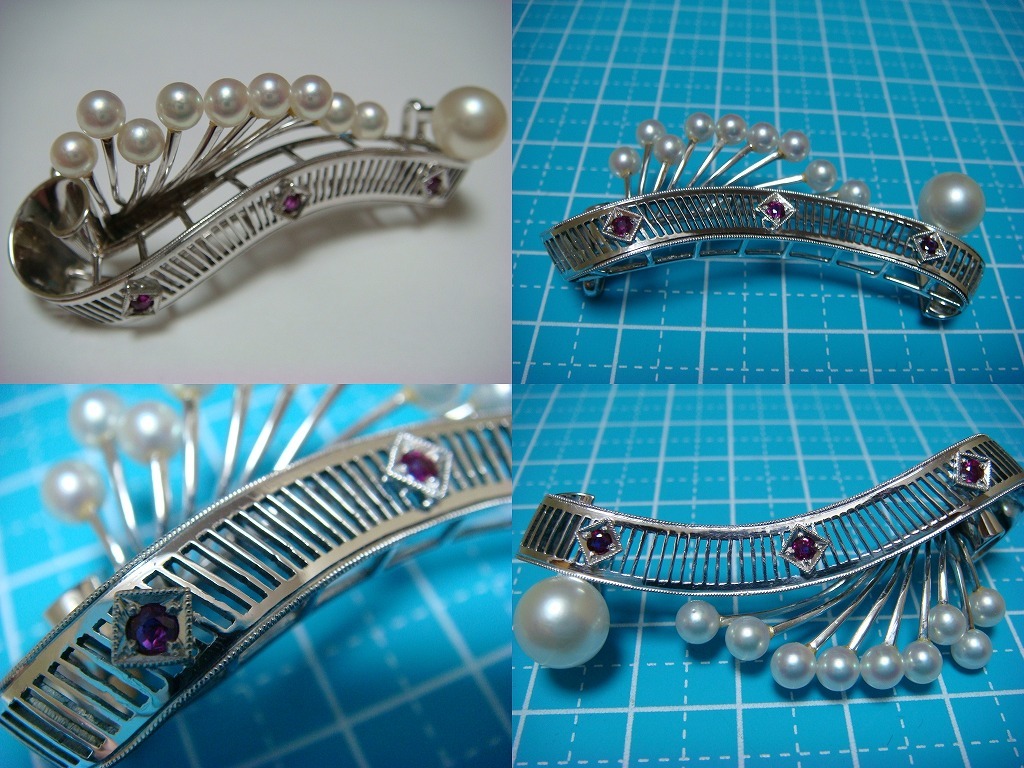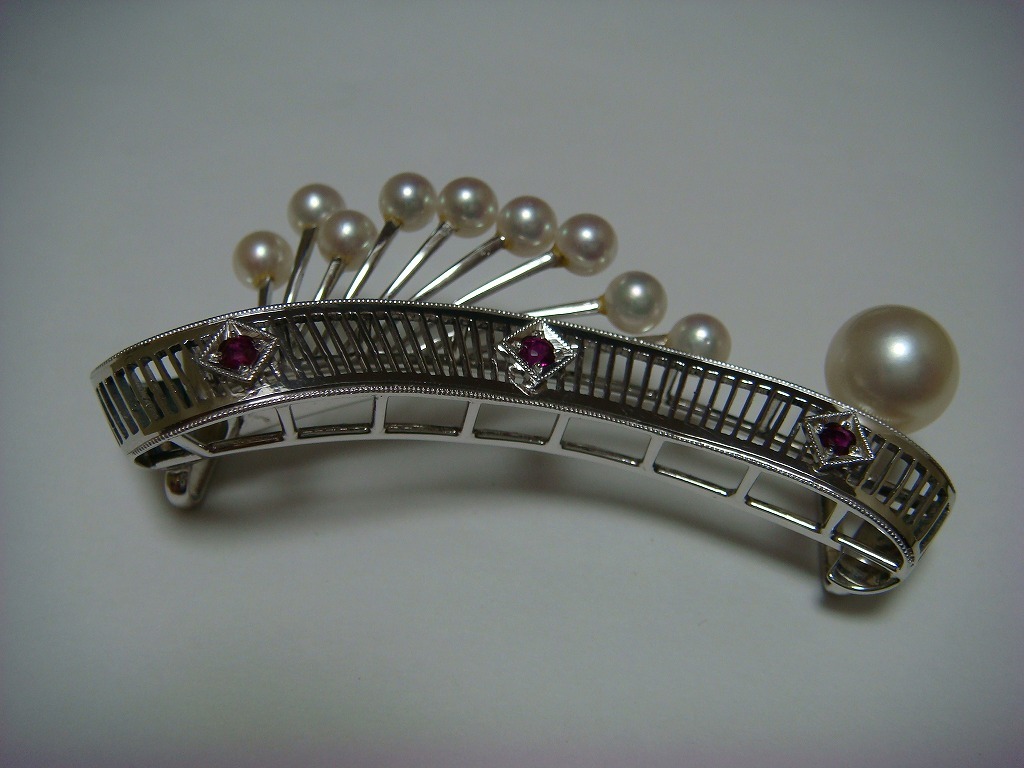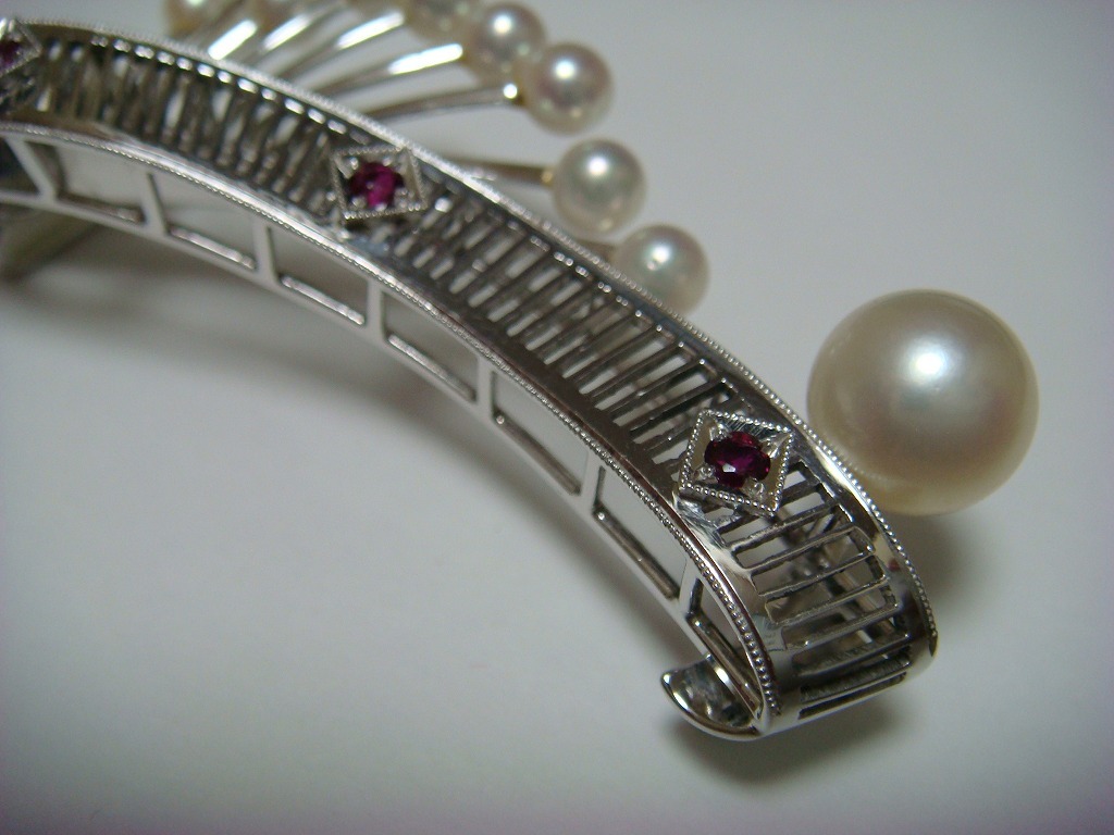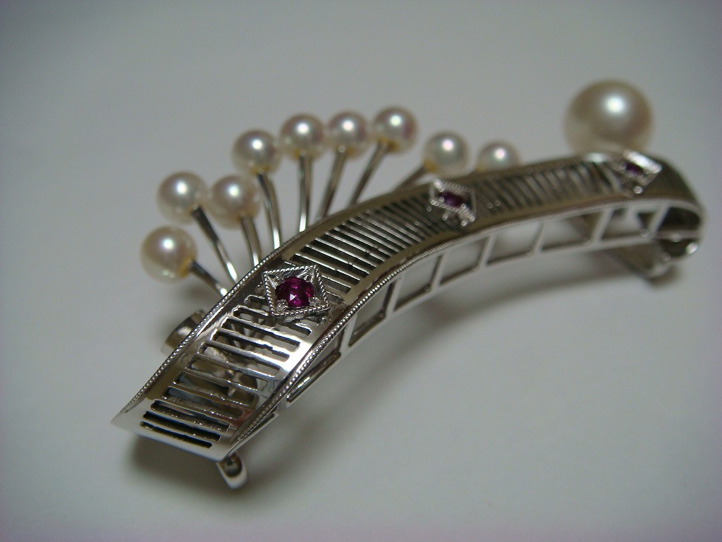 アンティーク  真珠とルビーの繊細なデザインの帯留めです。14金製です。WG K14の刻印入り。