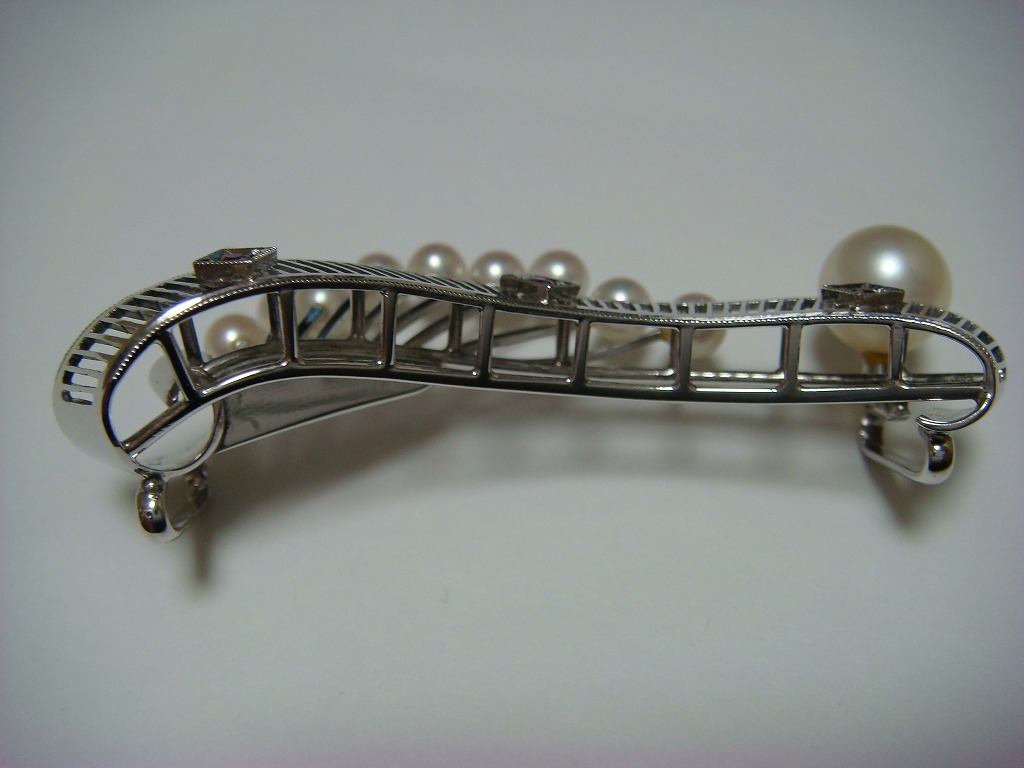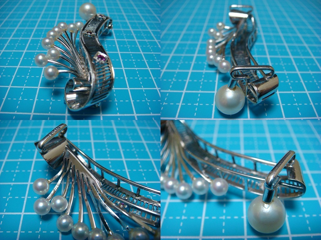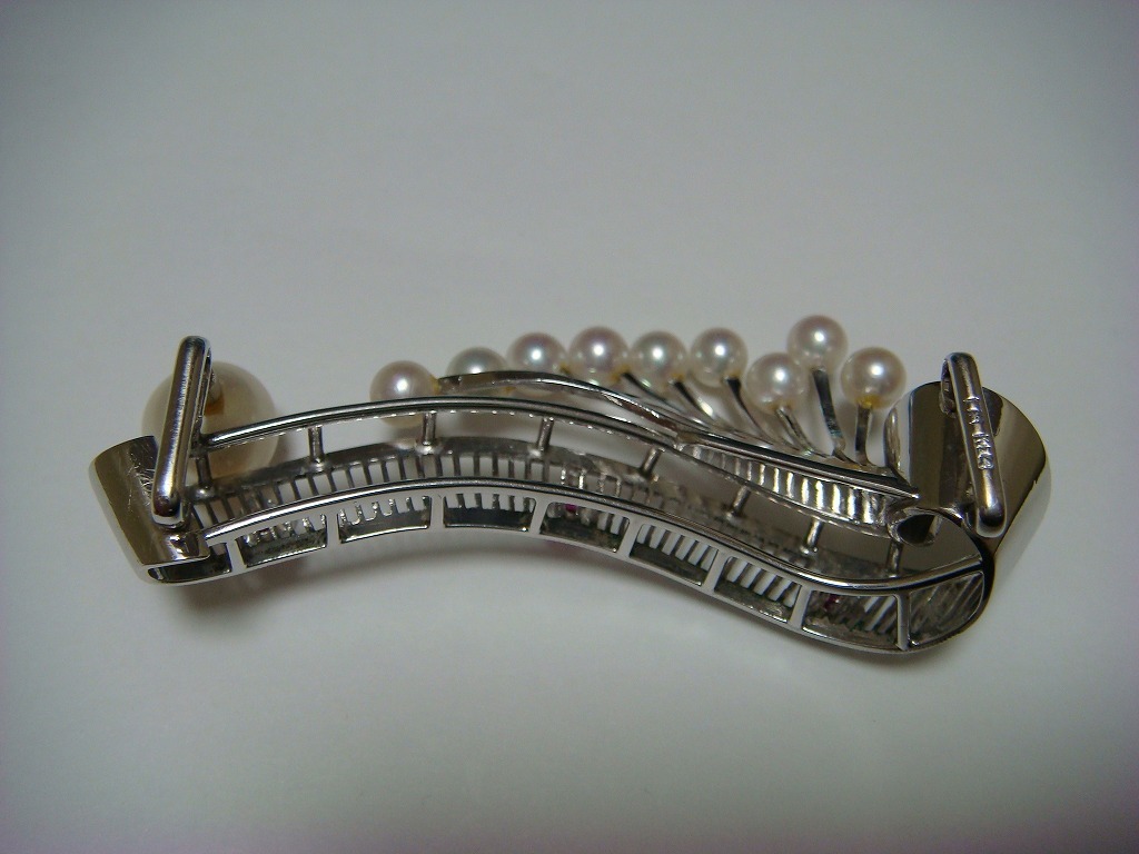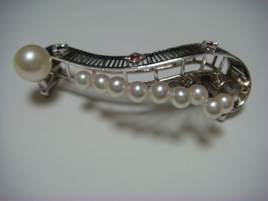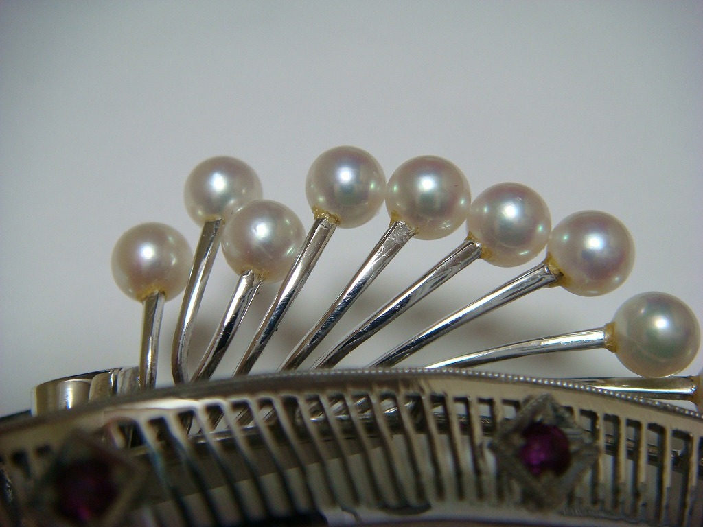 アンティーク  真珠とルビーの繊細なデザインの帯留めです。14金製です。WG K14の刻印入り。