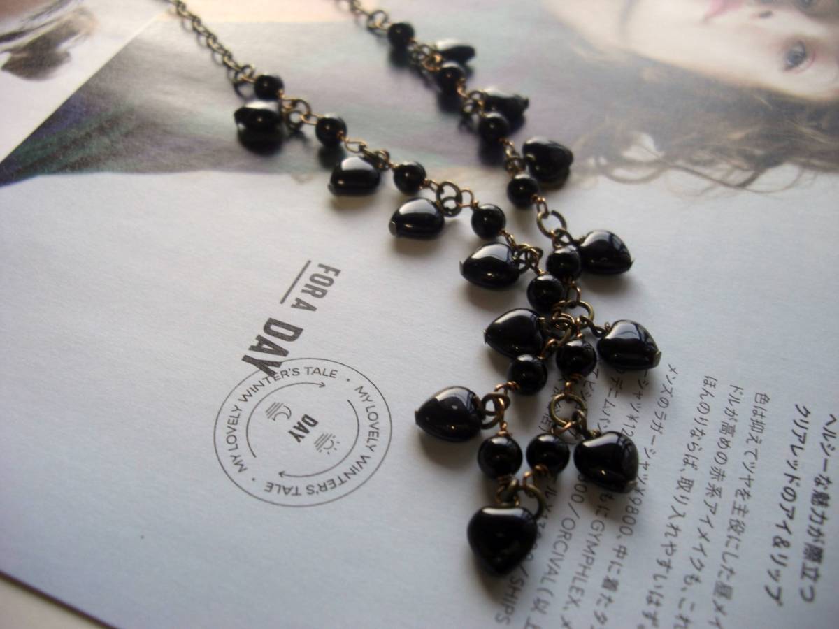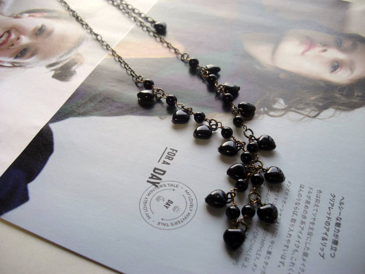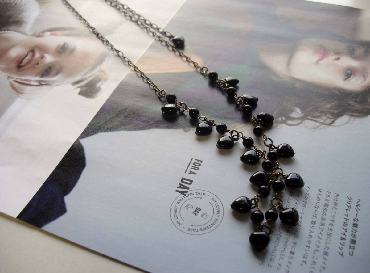 フレンチ・シック・・シリーズです♪オニキスのハート・・深い黒のオニキスのネックレスです♪小粒の丸玉やハートのオニキスを繋いでキュートな表情です♪4ミリの丸玉と8ミリのハートのオニキスを合わせました♪長さは66センチ位で調節自由です♪お 揃いのブレスレットやイヤリングも出品しています♪ハンドメイドをご理解頂いてノークレーム、ノーリターンでお願いします