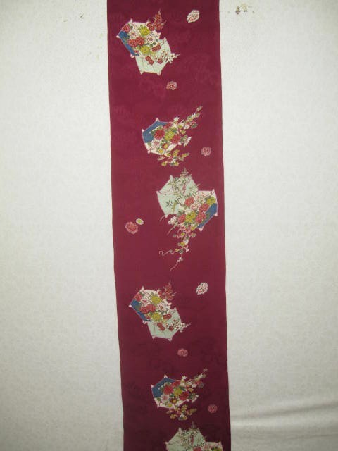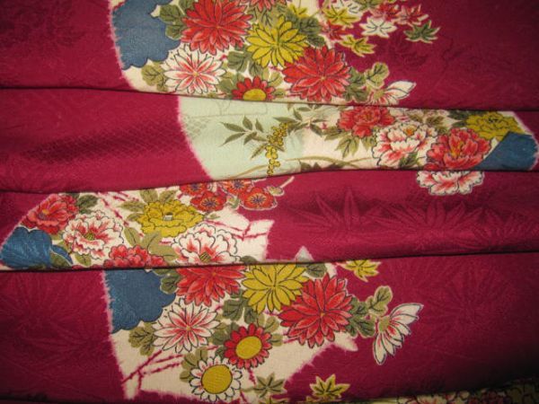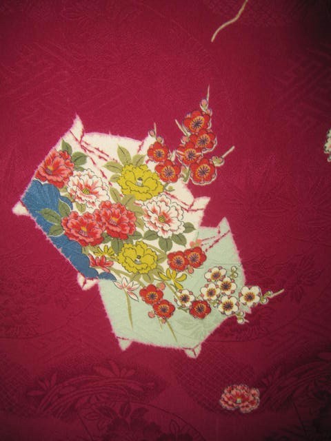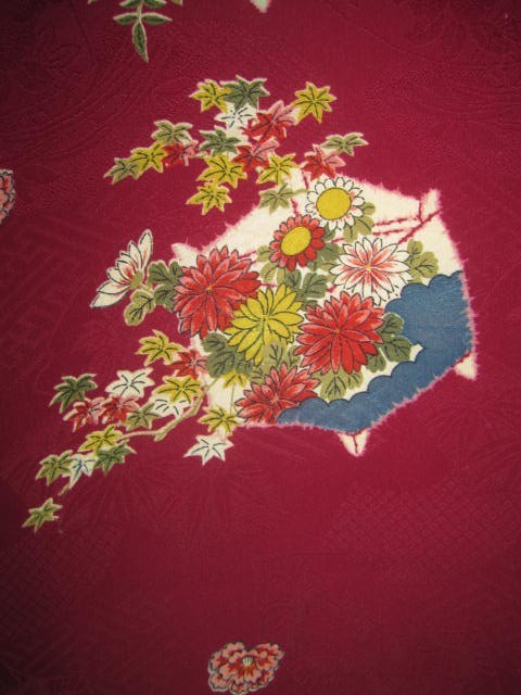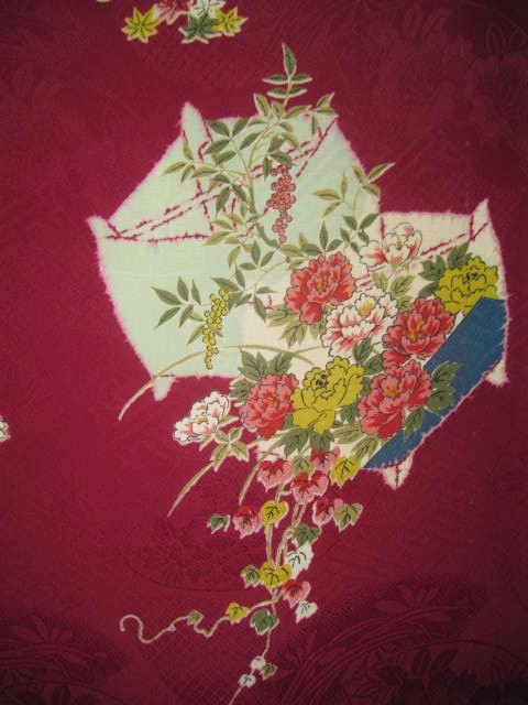 古布=73★濃い赤*糸巻き*牡丹*菊*山ぶどう*椿*梅*綸子*古布はぎれ★人形/吊るし雛
