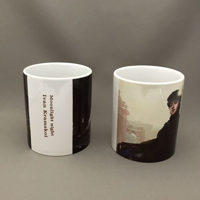 イワン・クラムスコイの忘れえぬ女、月明かりの夜の絵を、それぞれ左右両面にプリントした、陶器マグカップ2個セット、新品。