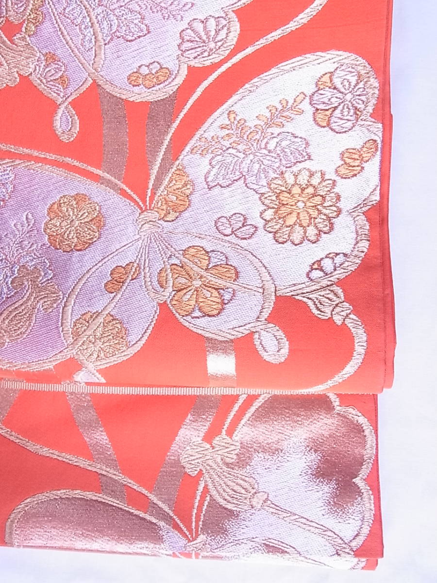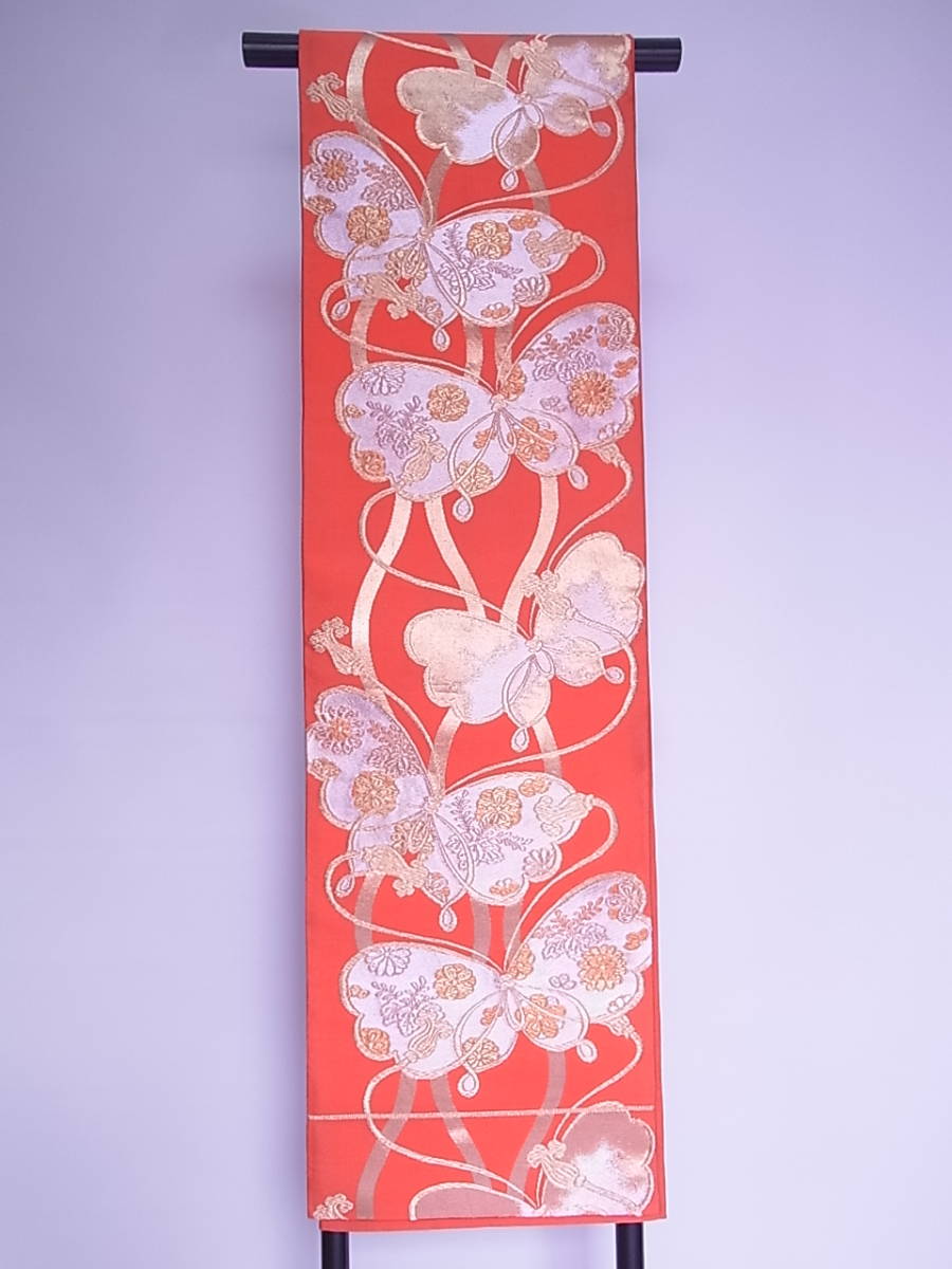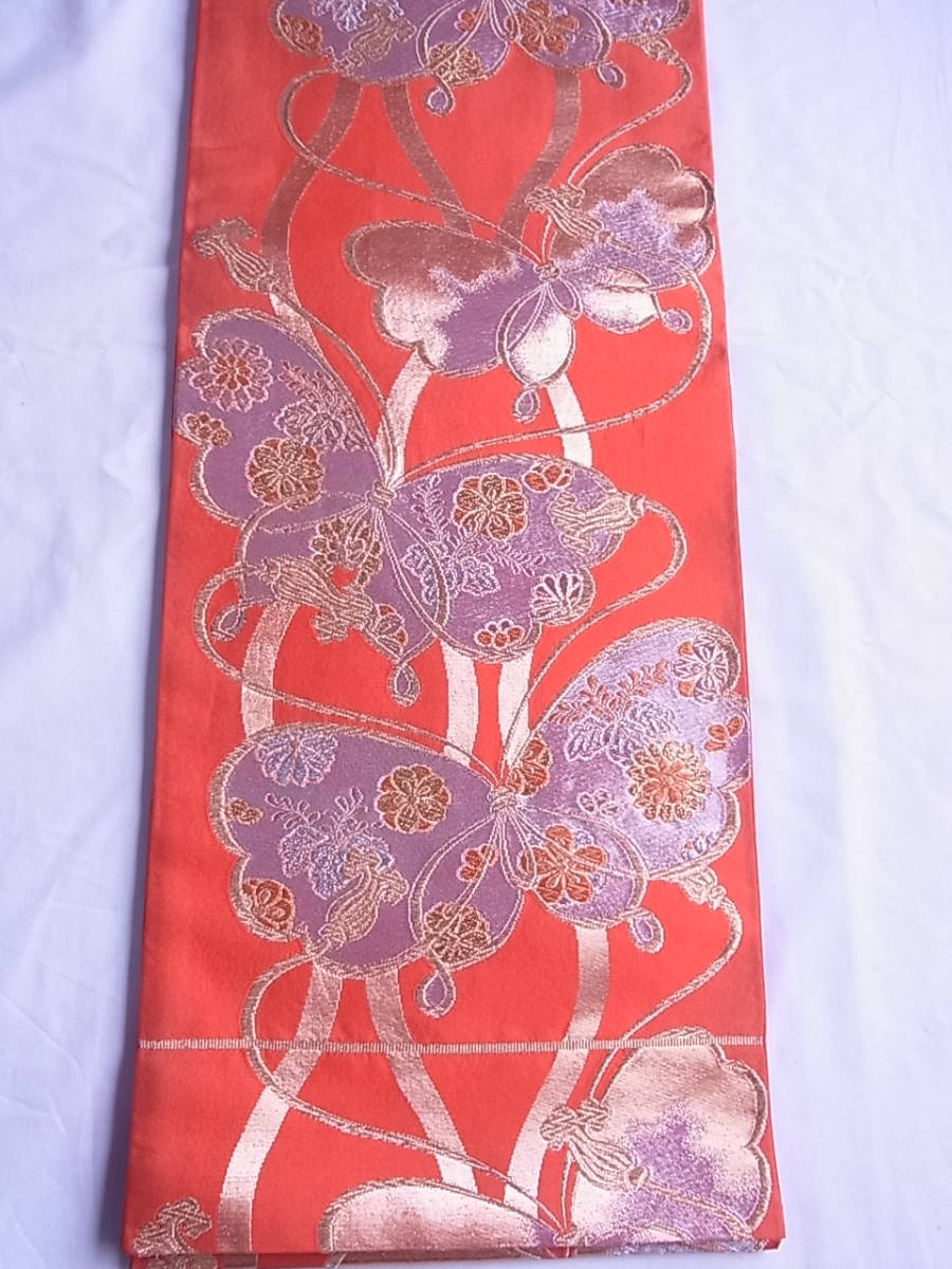 正絹  袋帯 朱赤 縦涌に蝶  着付けの練習用