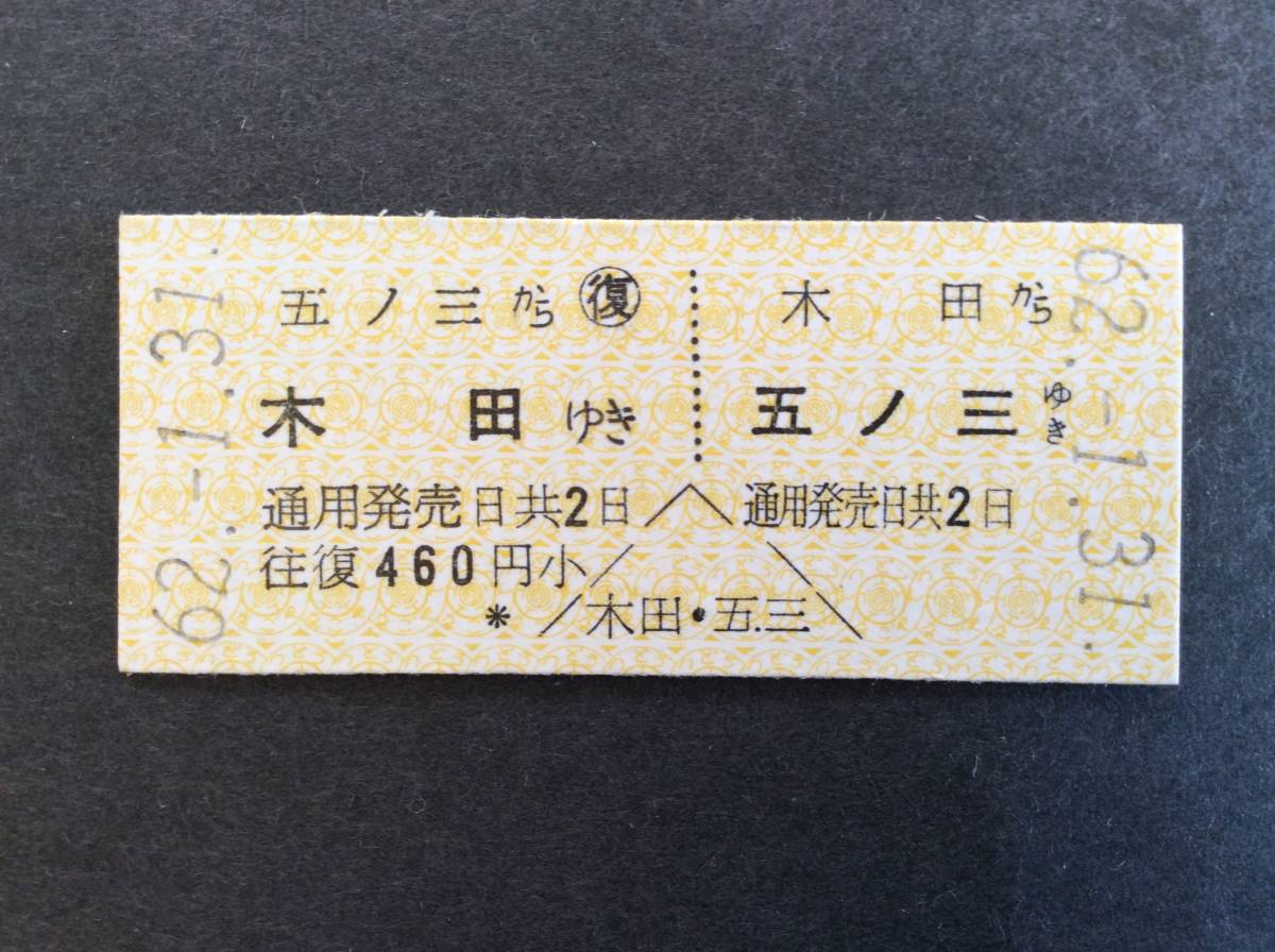 名鉄 往復乗車券 木田ー五ノ三 昭和62年