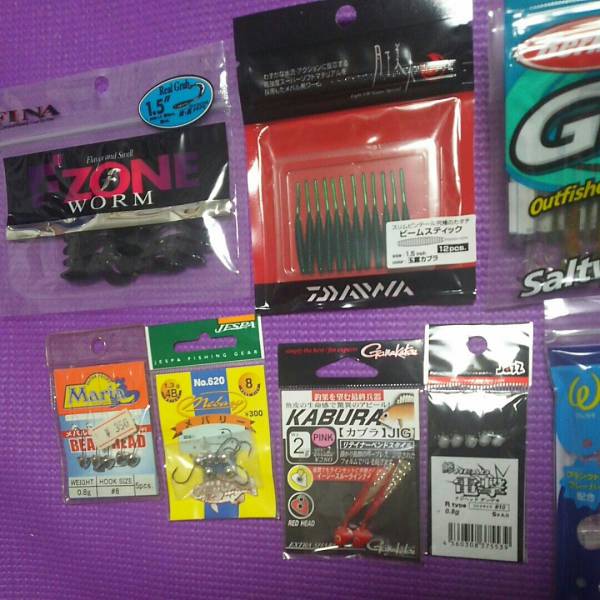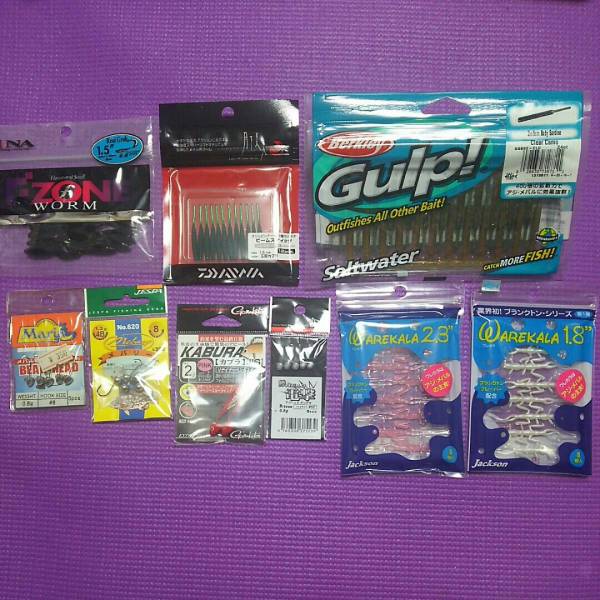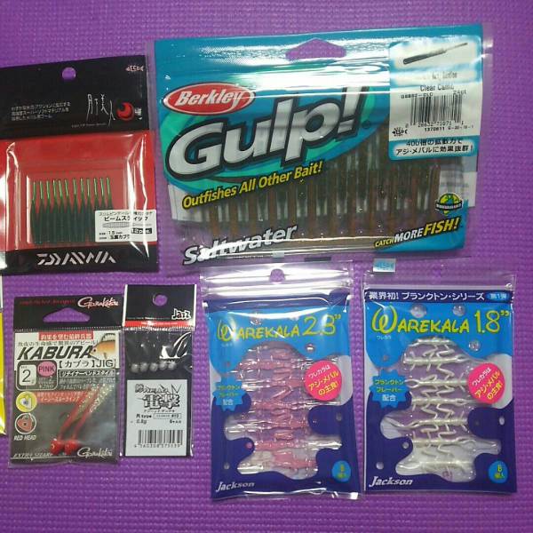 ワームは業界初のアジやメバルの主食プランクトンをイミテートしたことで盛況のジャクソン 2袋と老舗 FINA のF-ZONE、 ダイワ 月下美人、 定番 バークレー のガルプ ベビーサーディン 各1袋の合計5袋になります。