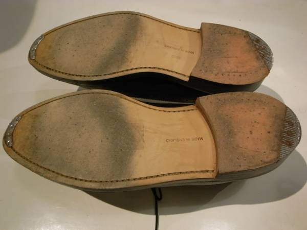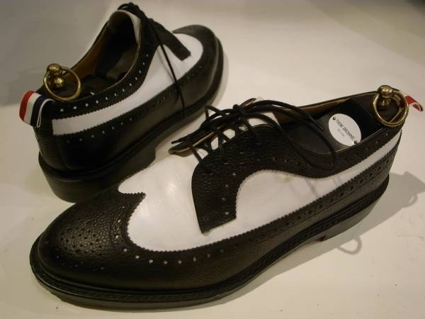 この他にもハイブランド等の商品を多数出品しています。 ●品名 : Thom Browne(トム・ブラウン ) / ウィングチップ・シューズ(買収前の初期物) ●色柄 : 黒x白 ●価格 : 20万円程度 ●産地 : イングランド ●サイズ : 表記なし(28-29cm相当) ※アウトソールは約32cm ●状態 : 8/10 (5回程度の着用) ●素材 : 本革 ●付属 : 正規シューツリー(ロゴ・プレート付) 【補足説明】 ●トム・ブラウン初期(買収される以前)のハンドメイド時代の貴重な革靴です。(個人オーダー品です) ●現行品のようなサイズタグではなく、内側に手書きでサイズ等の記載があります。(写真参照) ●着用回数も少なく、ソールの磨り減りもあまりありません。内側も擦り切れ等なく、キレイです。 ●アッパーの黒色部は型押しレザー、白色部はスムースレザーが使用されています。 ●ソールはレザー仕様。つま先とカカト部には金属プレート(錆あり)が施され、擦り減りにくくなっています。 ●アウトソール裏には「MADE IN ENGLAND」の焼印があります。 ●貴重な正規シューツリー(ブランドロゴプレート付き)が付属します。 【注意事項】(入札前に自己紹介もご一読ください) ●返品・返金には応じ兼ねます。商品状態は写真・説明文・質問でご判断ください。(タバコ無/ペット無) ●発送は、匿名の「日本郵便orヤマト運輸」でとなります。 ●条件によっては、即決(早期終了)や値引き等も受け付けますので、質問欄よりご連絡下さい。
