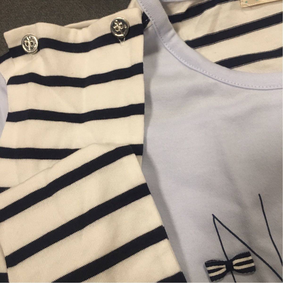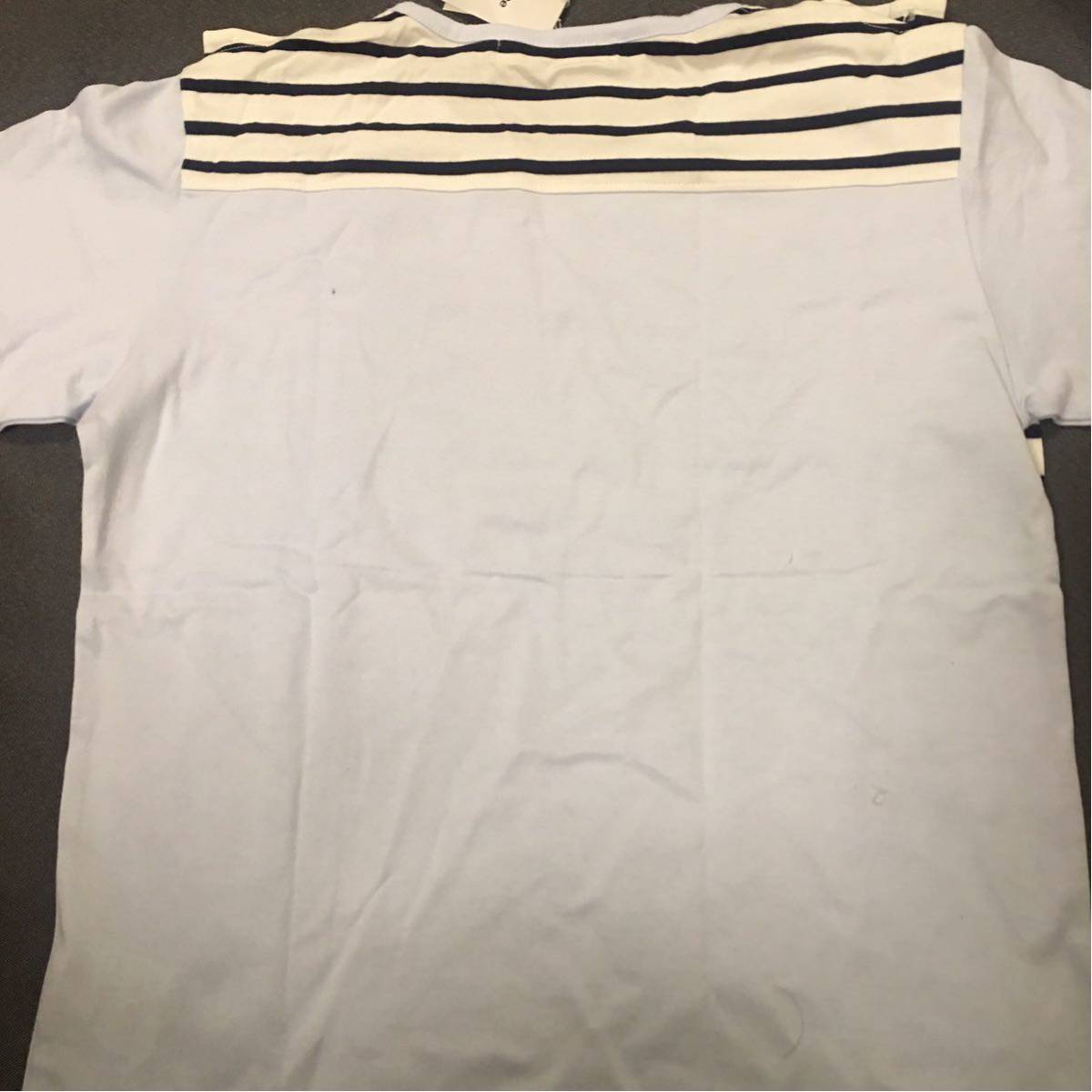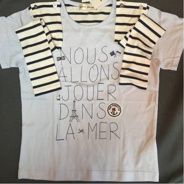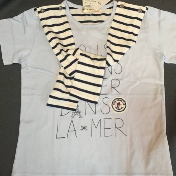 ポンポネット新作取り外し可能ボーダー柄衿ロゴプリント半袖Tシャツ140cm水色新品