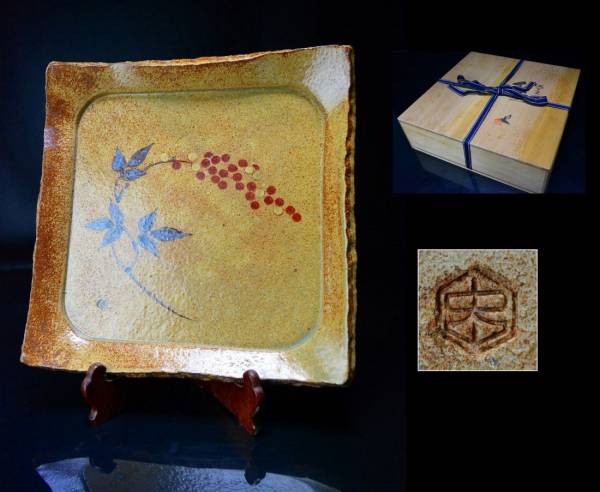 特選逸品【番浦史郎】作 南天文四方皿 共箱    B997