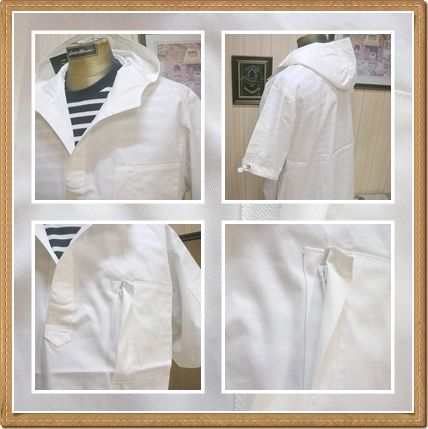 上品な白 パールホワイト pearl whiteマジックテープのかぶりハーフプラケットのこだわりデザイン。ハンサムカジュアルな フード付パーカードブルゾンジャケット です。こちらは裾と左袖に紐有りのオシャレデザインです。左袖と左胸にジップ付きポケット。生地は パールホワイト 純綿 綿 100% 生地です。 軽い着心地素材です。  サイズ(平置実測採寸)は 肩幅 46cm 着丈 66,5cm 身幅(脇下) 57cm 身幅(胴部分) 57cm 半袖丈(肩上先より) 23,5cm の M サイズ表示です。 そして 念の為 各部分のサイズ数値を 必ず 吟味 ご確認下さい。こちらは、こだわりの優れた縫製の日本製品です。勿論 新品です。店頭販売価格(税抜) 8,900円 です。尚、当商品は店頭にても、同時バーゲン販売致しております故、売り切れのケースもあります。その場合 お取引頂けない場合も有ります。予め ご了承 ご容赦頂きます様 お願い申し上げます。また、毎週木 日曜日は業務定休日で御座います。ご連絡、ご発送とも休業日明けにずれ込む事 ご了承下さい。