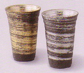 ●新品・伝統工芸品・淘悦窯・金銀刷毛反型ペアビアカップ大●