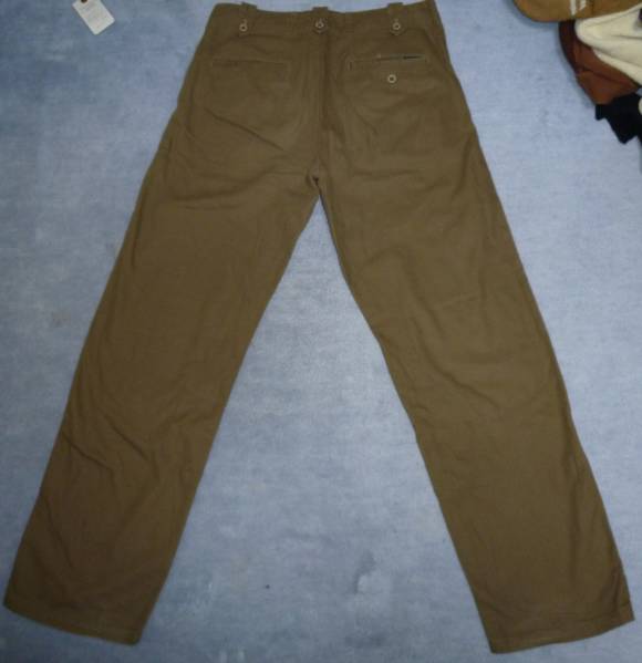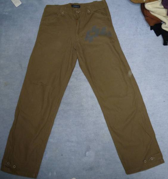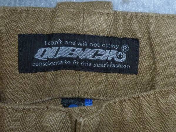 quenchらしいこだわりがありしっかりとしたつくりのチノになり、変わったおり方で各ベルトループはボタンで留める使用、フロントはインパクトのあるプリント、裾はボタンで細さを調整できるのでローカットの靴からブーツまで幅広く対応できると思います。