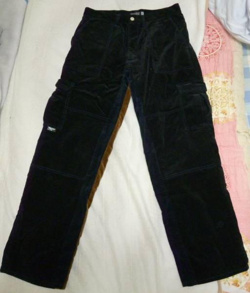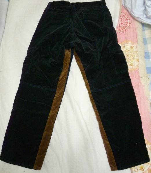 大変デザイン性の高いパンツになり、黒のコーデュロイに内側は茶色の切り返し、ステッチは青色になり他にはない雰囲気のあるパンツになります。
