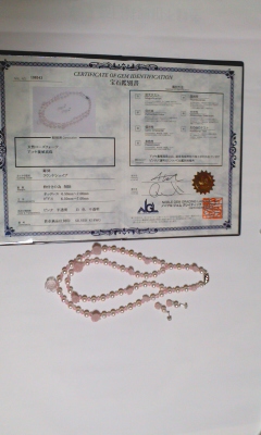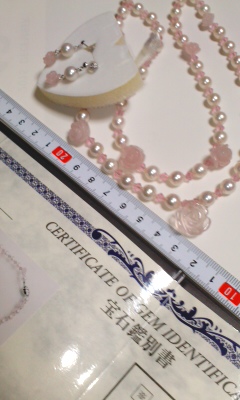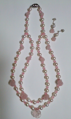 薔薇の形のローズクォーツに、アコヤ真珠とピンクのクリスタル?のような素材の、大変に豪華なジュエリーです