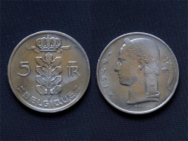 【ベルギー】 5フラン Fr 1949年 白銅貨